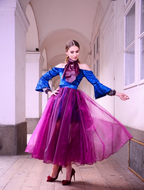 Compozițional, s-a inspirat din costumul lui Ludovic al XIV-lea, Regele Soare, renumit pentru extravaganța sa, iar ideea detaliului și al decorului ținutelor este preluată din specificul stilului rococo.