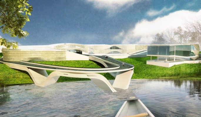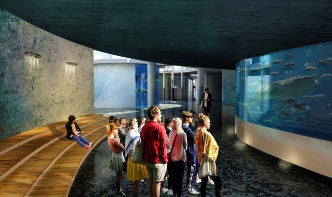 Primul pas în construcția volumului a fost organizarea acceselor și marcarea traseului continuu de vizitare. Ulterior, s-a realizat separarea funcțiunilor și localizarea pespectivelor favorabile din cadrul sitului. Spațiile de socializare au fost concentrate în partea stângă a volumului, restul fiind rezervat pentru expunerile peștilor. Iluminarea naturală a acestor spații s-a făcut prin goluri minimale pentru a păstra atmosfera misterioasă specifică programului de arhitectură.