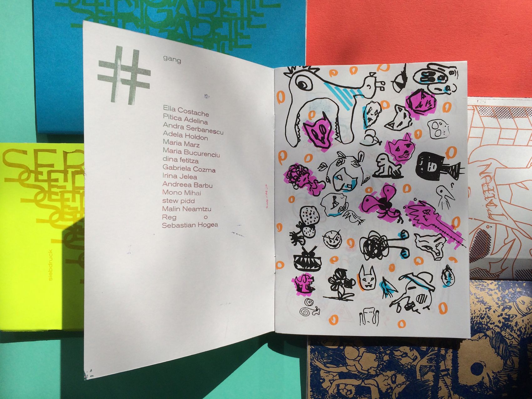 The Serigarfie zine was assembled during a screen-printing workshop, part of The Most Beautiful Books in Romania 2018 series of events. After a couple of days warming-up with comics exercises, the 15 participants experimented with screen-printing for two weeks, in a variety of colors, on a wide range of papers. The result is a monstrous collection of ghouls, weirdos and unpredictable drifts, some in markers, colored pencils and acrylic paints.