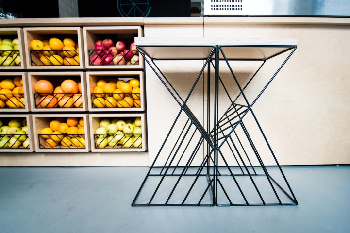 The three pieces from Fresco Furniture collection are marking the spacial dimension by using linear and brutal elements, that are also repetitional and planar, made from metal and wood. Diagonal Chair, Fresco Table and the Piramid shelves are designed studying the relation between volume and anti-volume, between solid and void through highlining with thin lines shapes that are in balance.