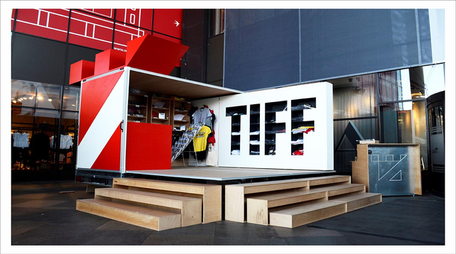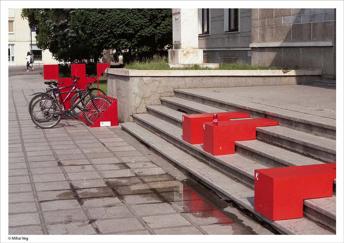 During Transilvania International Film Festival, the pavements and public spaces get activated by the collective enthusiasm of the city. In order to scale up this feeling, Prototip Studio materialized the spirit of TIFF by stacking cardboard modules to form new paths, directions and spaces for the avid cinephiles and festival goers. Inside, users were invited to explore InfiniTIFF at ClujHub, Casa de Cultură a Studenților and Ingmar Bergman’s Legacy Exhibition in the museum of art, while outside bike racks and stair-chairs became the protruding urban objects that coloured the city. In another form, TIFF was lifted off the ground and made into a mobile shop inside a refurbished caravan, where you could find the t-shirts for InfiniTIFF designed by Prototip.