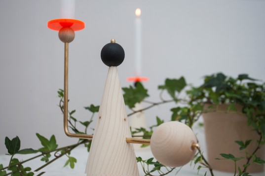 Decorative but also practical, offering a warm light and creating a cozy atmosphere, the candle holders were for a long time part of the main accessories within a house, now back with a modern touch. Can be used as a decorative object and also as an alternative source of ambient light. with a simple yet dynamic approach and the possibility of modular use. A composition of geometrical volumes, made out of concrete, wood and brass, finished with touchesof color, given by plastic shapes. The colored plastics double as a color filter, it can dim the light or the shape and the color can be projected on the wall.