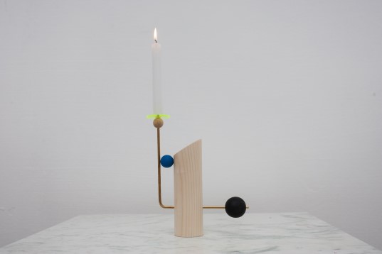 The candle holders were for a long time part of the main accessories existing in a house, offering a warm light and creating a cozy atmosphere. The candle holder brings to the attention of the public a decorative object and an alternative source of ambiental light. It is made by hand, the shapes being obtained on a lathe, and combined with brass and colored perspex. It is inspired by the simplicity of the Bauhaus, the colors and composition of Memphis, and the mid-century design.