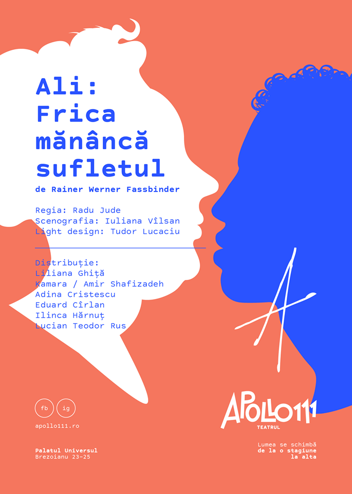 Radu Jude, regizor de film consacrat, își face debutul pe scena de teatru din București cu un spectacol după un text care, deși a fost scris în anii ’60, este, mai mult ca oricând, relevant în contextul actual. „ALI: Frica mănâncă sufletul” este adaptat după textul - devenit film - al celebrului regizor german Rainer Werner Fassbinder și abordează în fața publicului subiectul fricii, așa cum se manifestă ea în diferite contexte de actualitate, care fac referire la imigrație, iubire, prejudecată și cultura arabă. Acestea sunt ingredientele de bază ale poveștii de dragoste dintre doi oameni complet diferiți: Emmi, o femeie în jur de 60 de ani, și ALI, un imigrant marocan, cu 25 de ani mai tânăr. Trecând peste toate tabu-urile și depășind oroarea provocată în familie și printre cunoscuți, cei doi hotărăsc să se căsătorească.