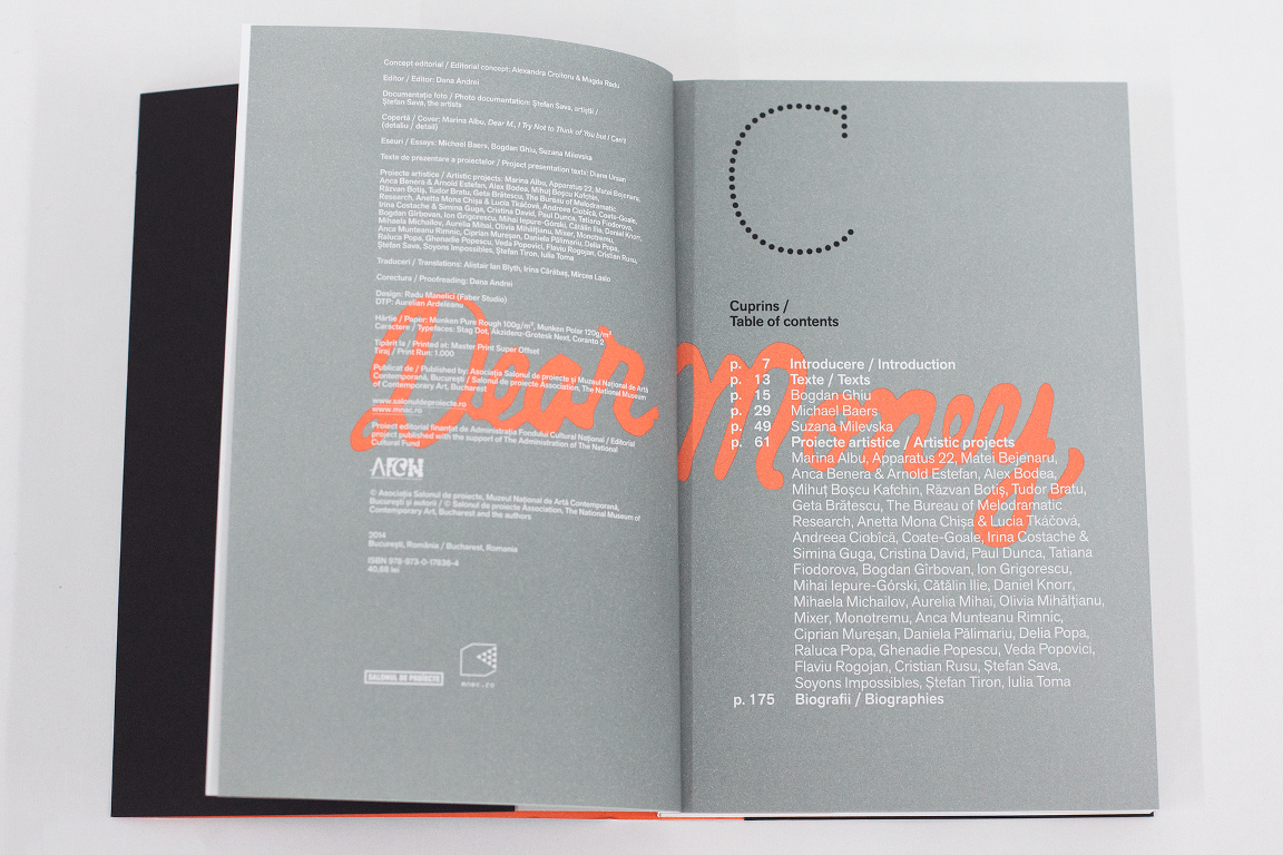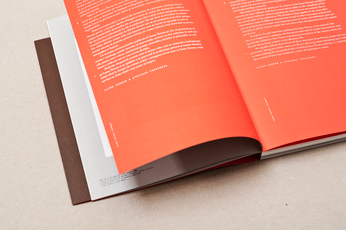 This book is dedicated to Ioana Nemeș, in token of our friendship and admiration for the manner in which she understood to translate in her artistic practice the fragile and often conflicting threshold between inner reality and daily reality, between the personal and the abstract, between language and representation. Even after Ioana was no longer among us, we continued to take the same stance with respect to her personality and way of being, to her disciplined and genuine manner of supervising the materialization of her ideas, of conferring matter to subjective time.