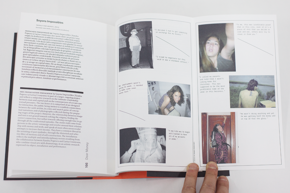 The Dear Money project was inspired by a work of artist Marina Albu and consists of forty contributions submitted by artists with whom the curatorial programme Salonul de proiecte had worked until 2013. The works tackle the relationship between art and money from various angles, through the perspective of some of the most relevant Romanian artists working today. The project also provides the opportunity to look back on Salonul de proiecte’s activity, a program that functions within The National Museum of Contemporary Art, Bucharest.