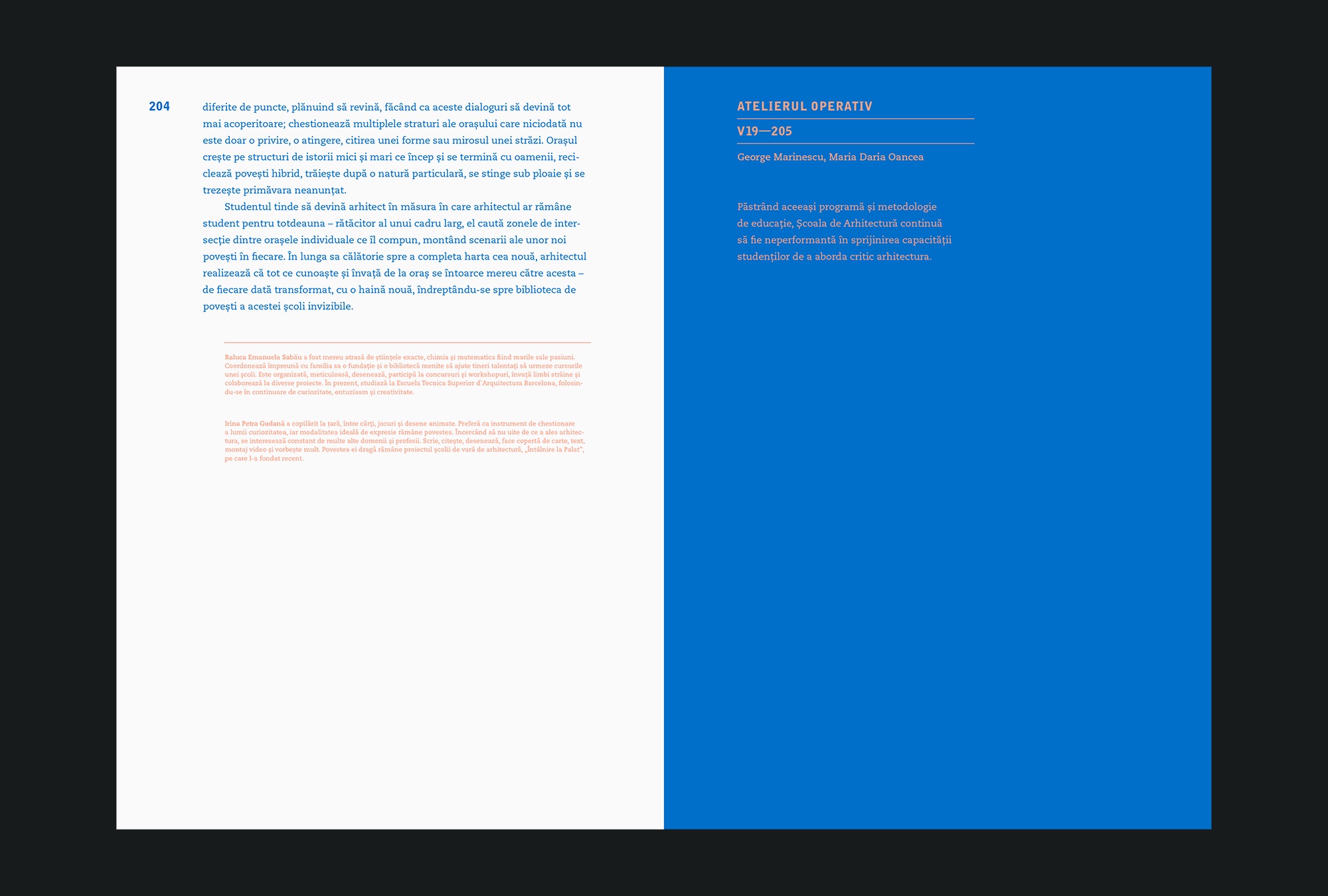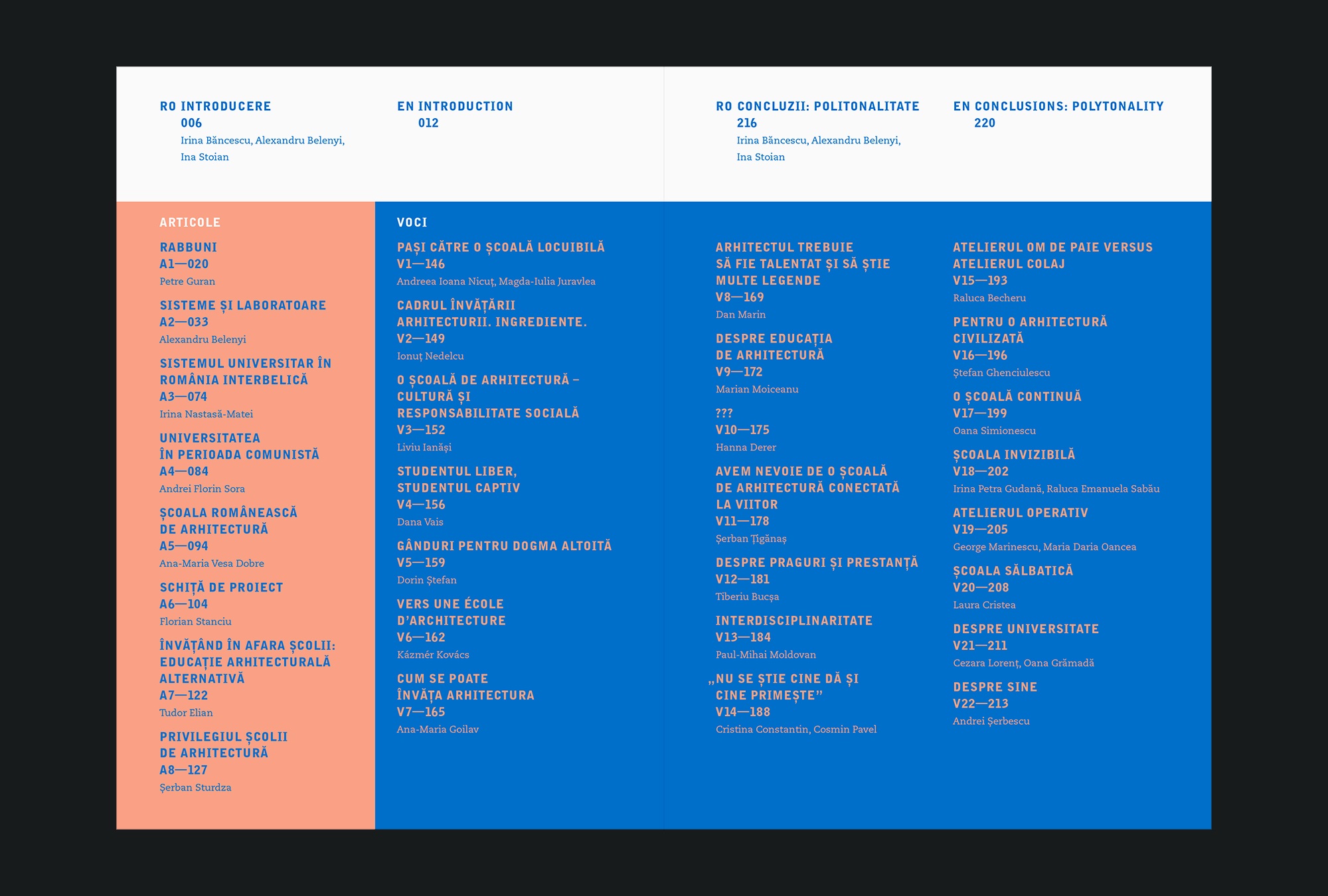 “The volume 2.14 Types of Architecture Schools attempts a radiography – heterogeneous, uneven, present – of the subject discussed globally, but mainly locally. It strives to open the subject to the public and to contextualize things for the first time, it offers a series of levers, but also vectors for those preoccupied by the subject – who are in fact more than at first sight. The Romanian civil society is consolidating fast lately and it already has on its agenda the issue of the built environment quality or the state of the patrimony: education environments should rapidly build their ability to provide answers and especially guidelines for the future.
