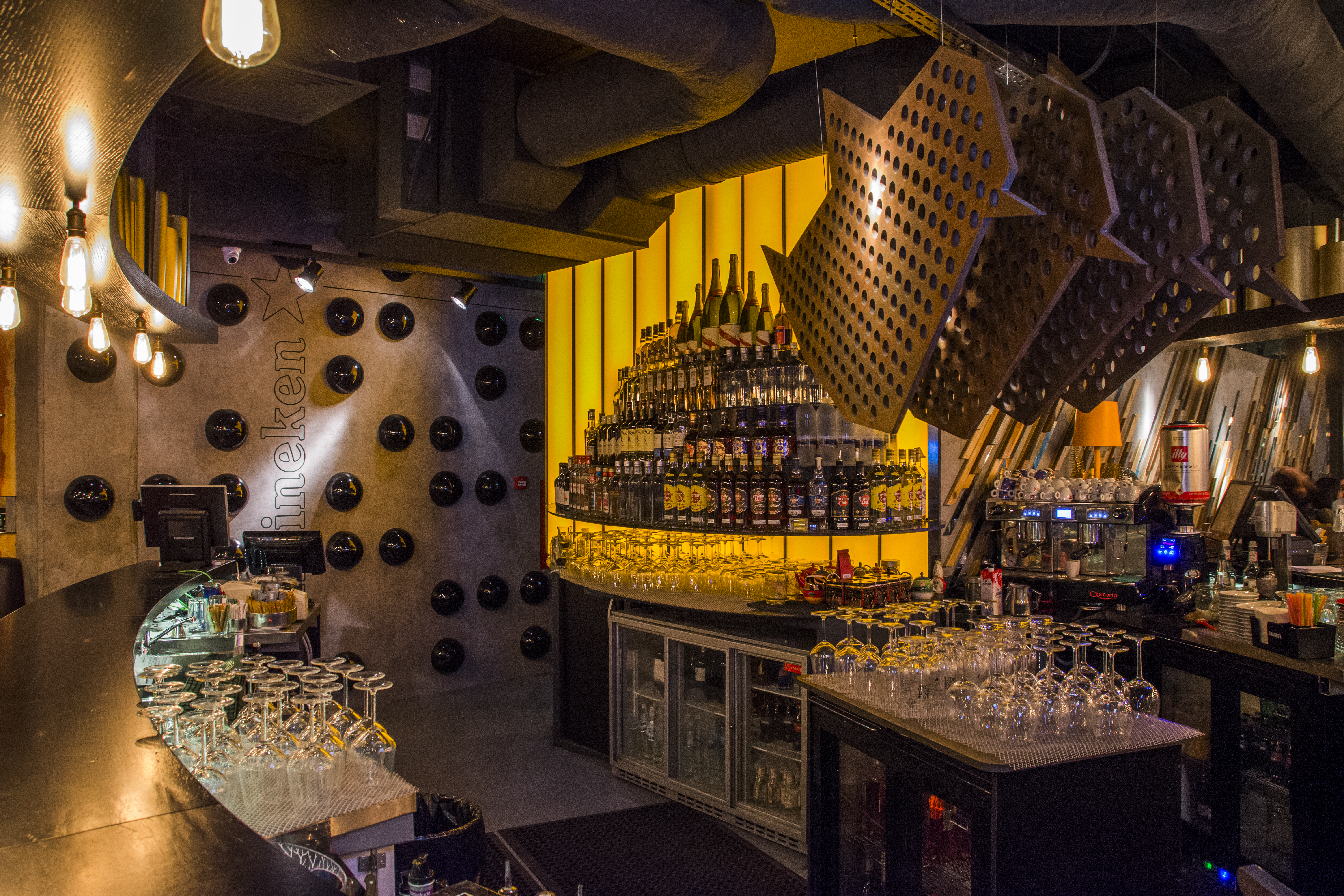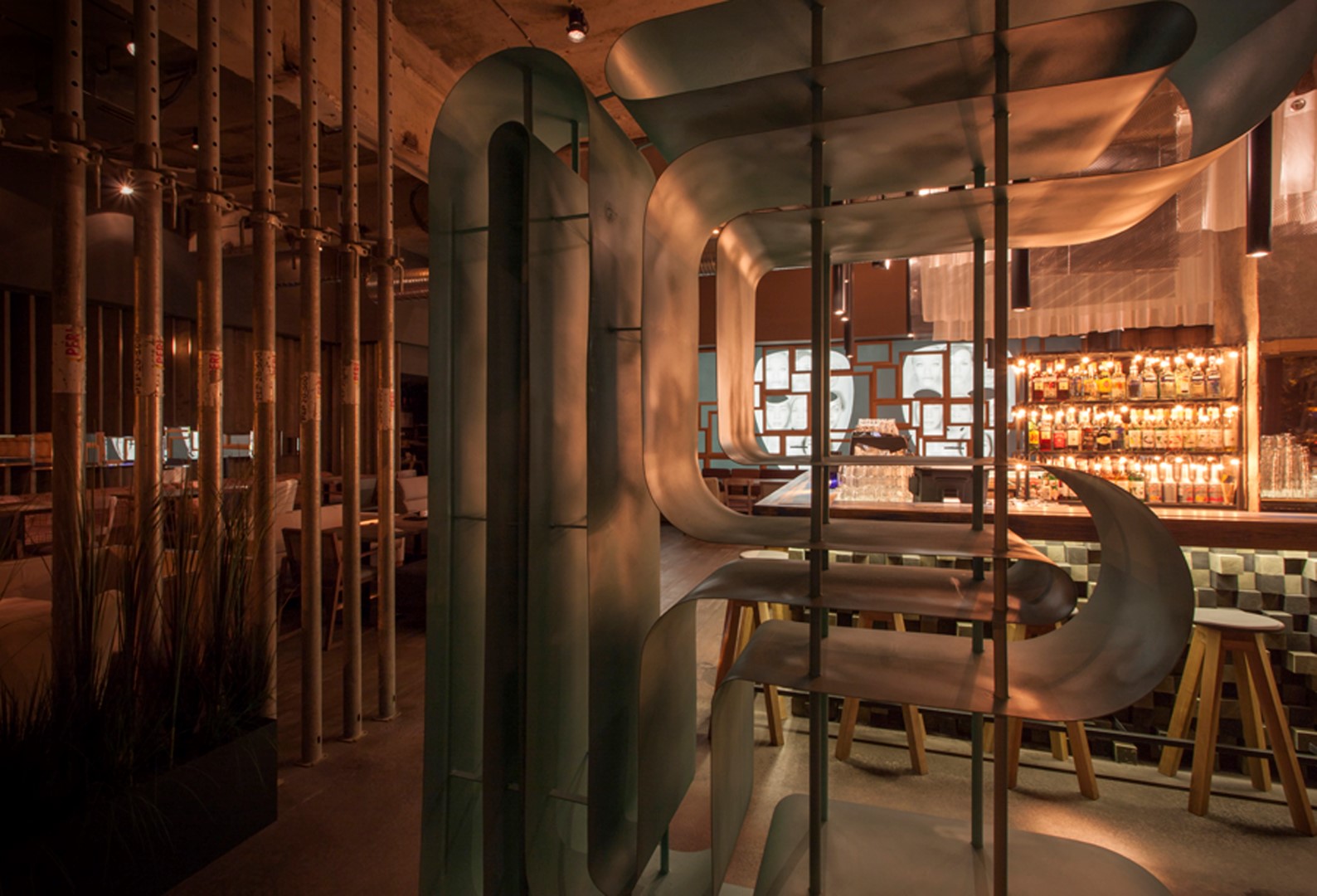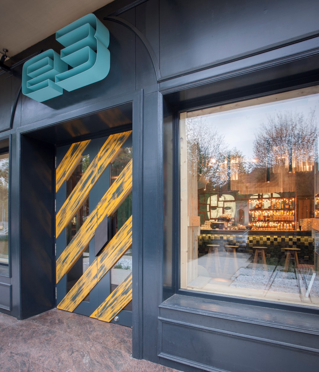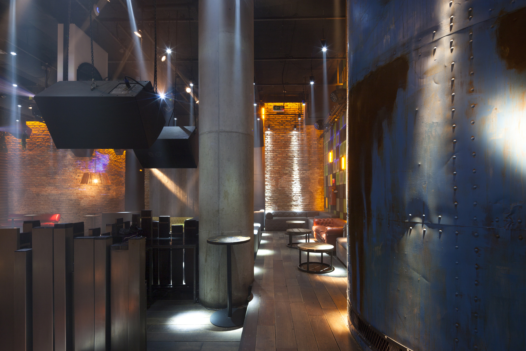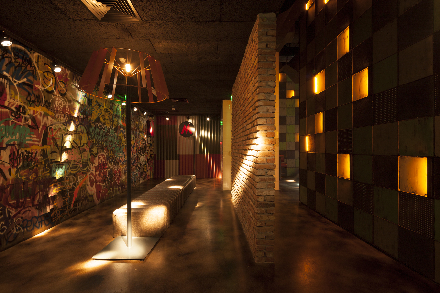 The rough materials brought into dialogue by the rythm and the anti-rythm are a constant theme of this place’s ambient. The bar is a first counter where since you get close you dock to the proposed socializing game. The three huge graphic masques as an enlighting wall across the entrance composed from diverse faces, culturally ambiguous, show the light of the great déjà vu that we join. The filter of an imposing “E” at the entrance reminds us that we pass the portal to a new state of mind.
