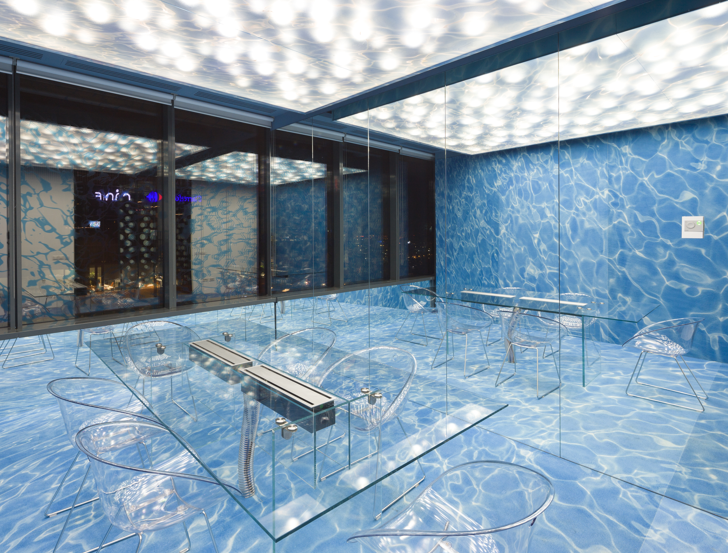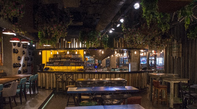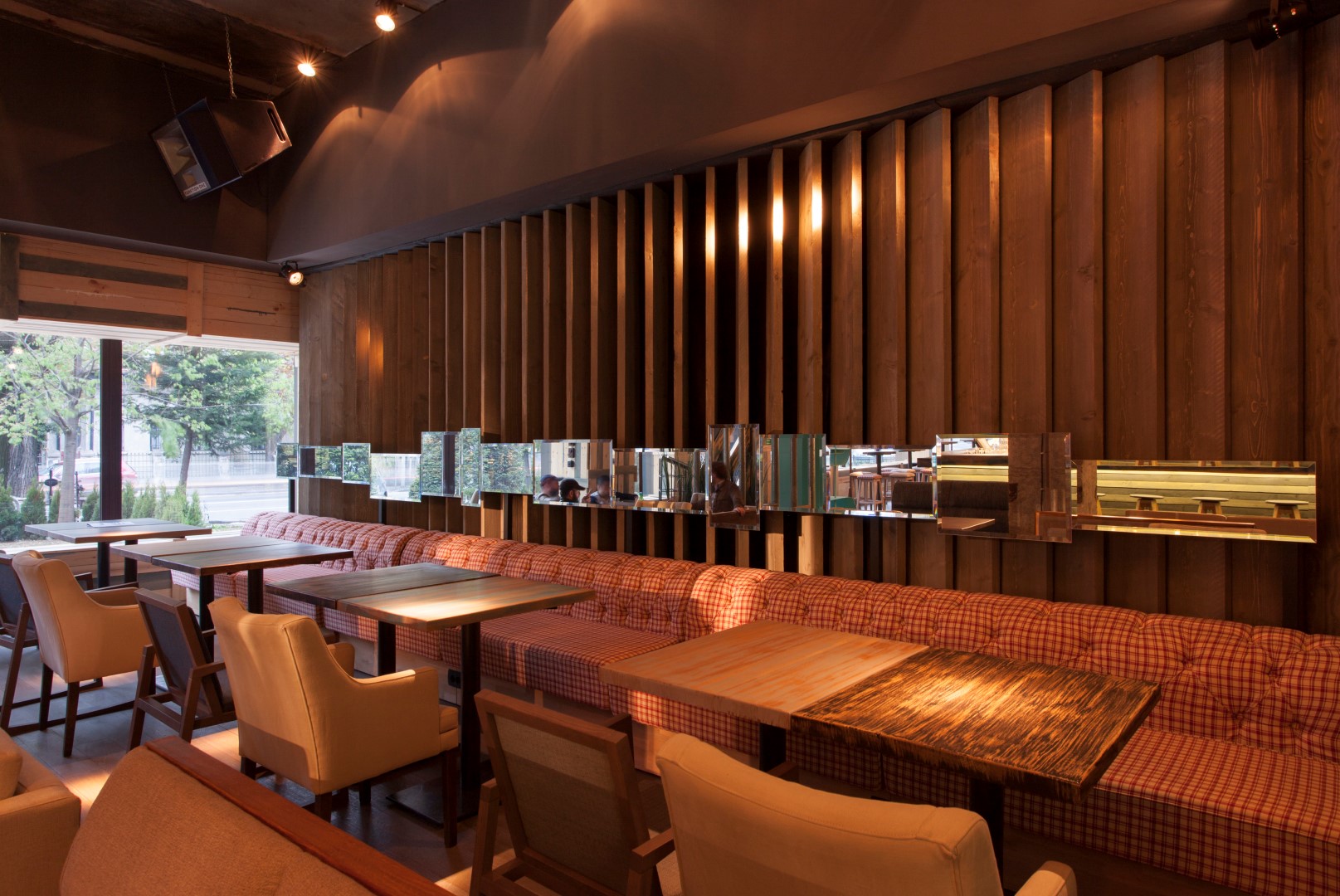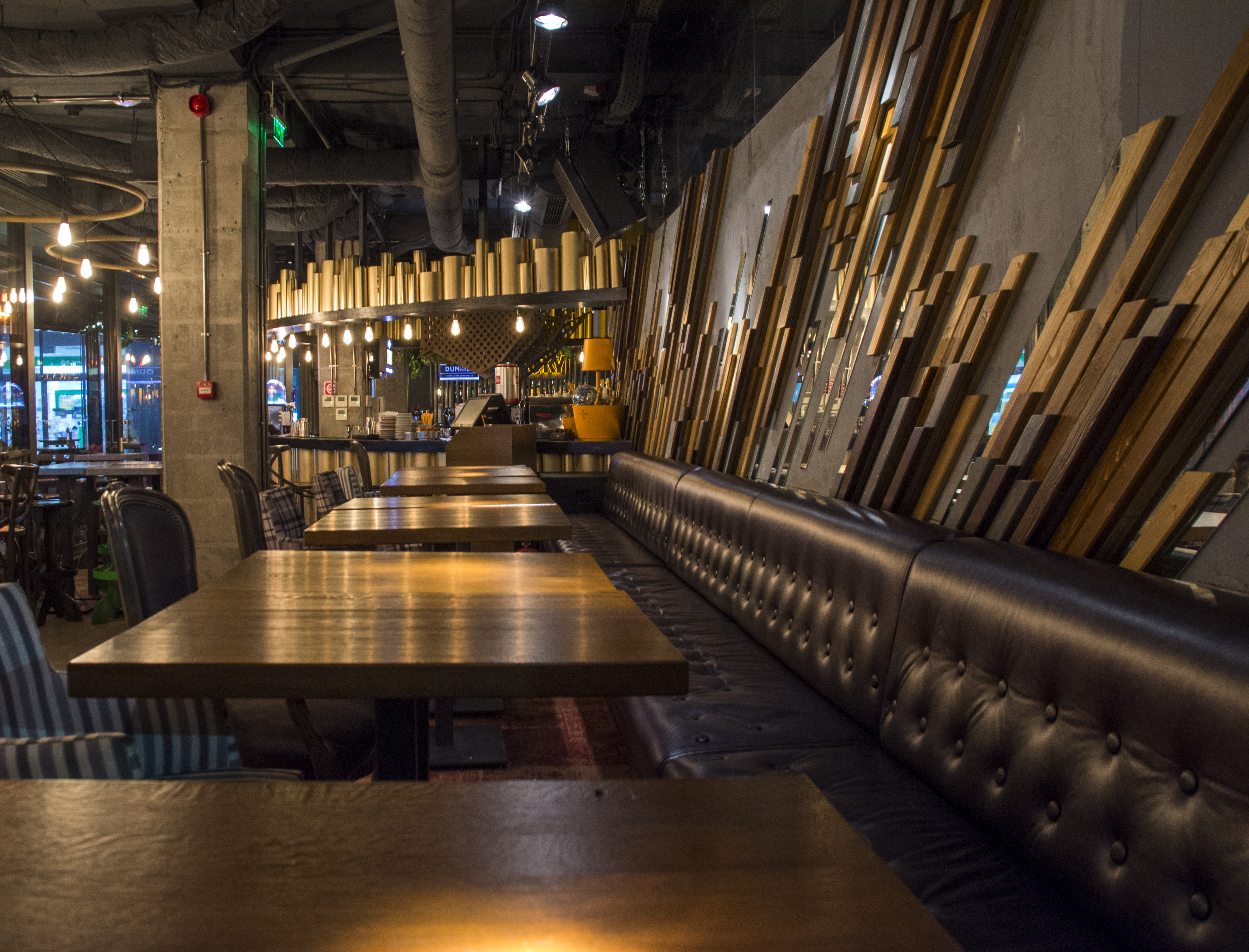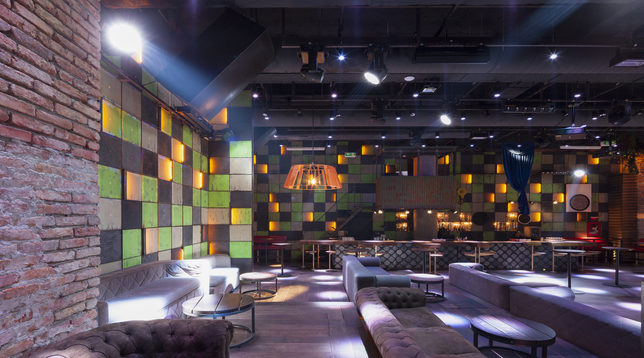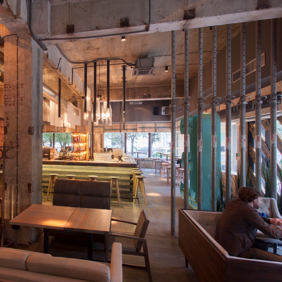 The rough materials brought into dialogue by the rythm and the anti-rythm are a constant theme of this place’s ambient. The bar is a first counter where since you get close you dock to the proposed socializing game. The three huge graphic masques as an enlighting wall across the entrance composed from diverse faces, culturally ambiguous, show the light of the great déjà vu that we join. The filter of an imposing “E” at the entrance reminds us that we pass the portal to a new state of mind.