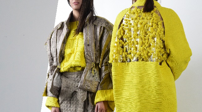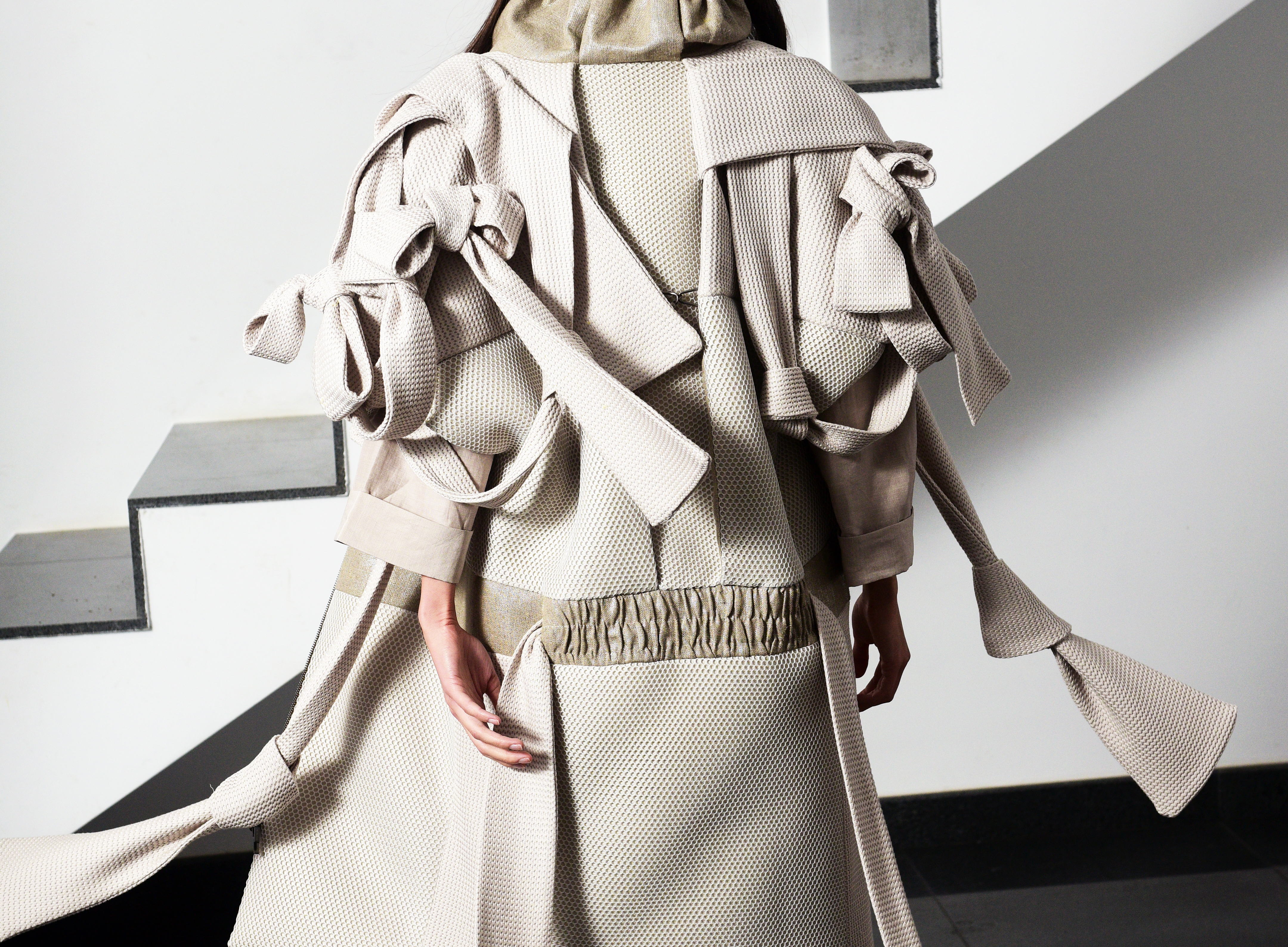 The designs contain rhythmic structures, complex details, having as the visual leitmotivs the bow and the square, in a chromatic palette of warm greys and saturated yellow.