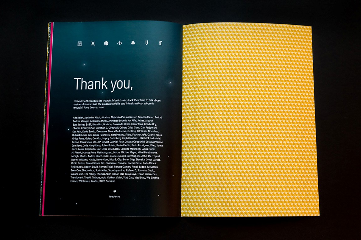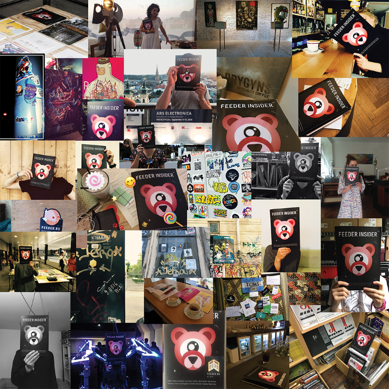 The printed edition, feeder insider booklet #02, features 14 interviews that shed light on motivation, process and perception in the arts, with Saddo, Primarie, Brosmind, Livia Coloji, Gus Gus, Karim Rashid, Tokyotoys, Olga Ziemska, Ioana Sisea, Yomsnil, Julie Marghilano, The Model, Borusiade, Roman Tolici. In 2016, the feeder insider pop-up gallery animated Kube, Lente and Palatul Universul.