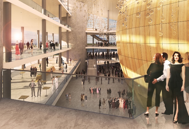 Foaierul este atașat fațadei pentru a oferi publicului perspectivă asupra parcului și orașului vechi. El este separat de volumul sălii printr-un atrium, accesul în auditoriu făcându-se pe pasarele. Pe timp de noapte, întreaga fațadă, privită din exterior, devine un spectacol, fiind animată de mișcarea oamenilor.