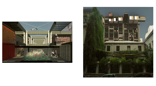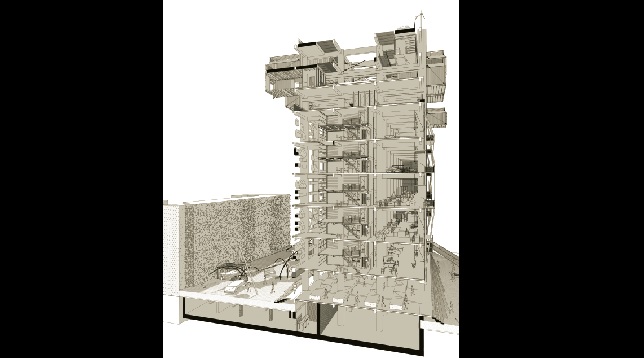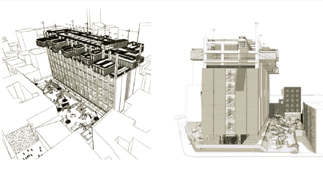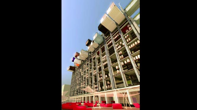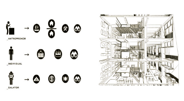 Site-ul este înconjurat de numeroase funcțiuni arhitecturale (culturale, educaționale, comerciale, loisir, locuire etc.), doar că domeniul locativ al zonei este satisfăcător și învechit, nefiind raportat unui stil de viață actual. Așadar, se propune convertirea unei foste clădiri de birouri în mix funcțional cu locuințe de producție (locatarul primește o grădină verticlă, un duplex și un spațiu de lucru aferent unei străzi publice în aer, a cărei fațadă poate fi folosită ca spațiu loisir prin rabatarea peretelui ce devine balcon (living facade - etajele 1-5), locuințe nomade - etajul 6 (spațiu de campare cort/patinuar/catwalk/carting), locuințe colective - etajele 7-8 (container+gradină), spațiu de loisir/gradină publică-acoperiș terasă.