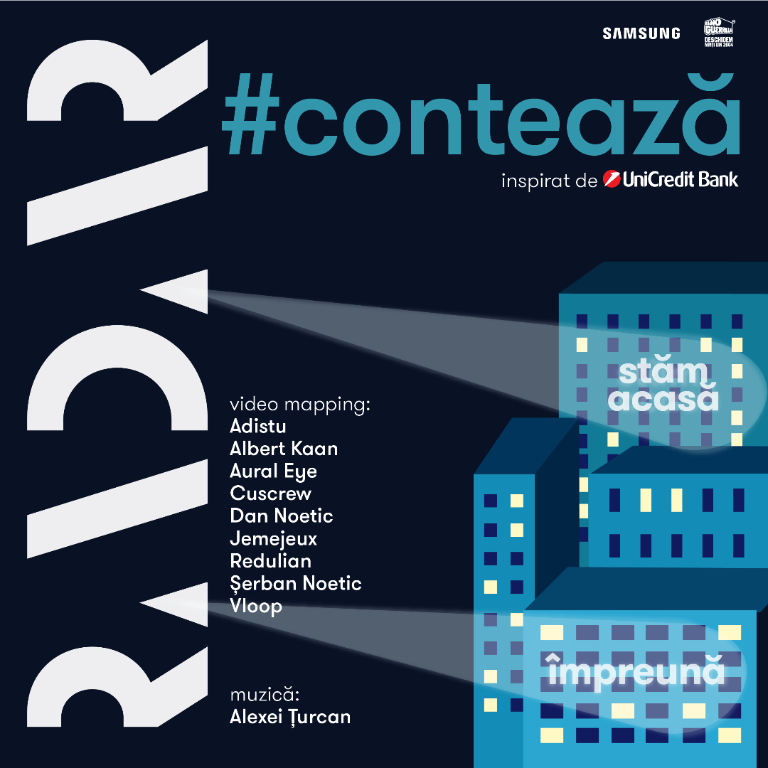 Sâmbătă, 18 aprilie, RADAR lansează „STĂM ACASĂ #CONTEAZĂ” inspirat de UniCredit Bank, un proiect de conștientizare ce îndeamnă românii să rămână acasă și prezintă în avanpremieră scena de video-mapping din cadrul celei de-a doua ediții a festivalului de new media art.