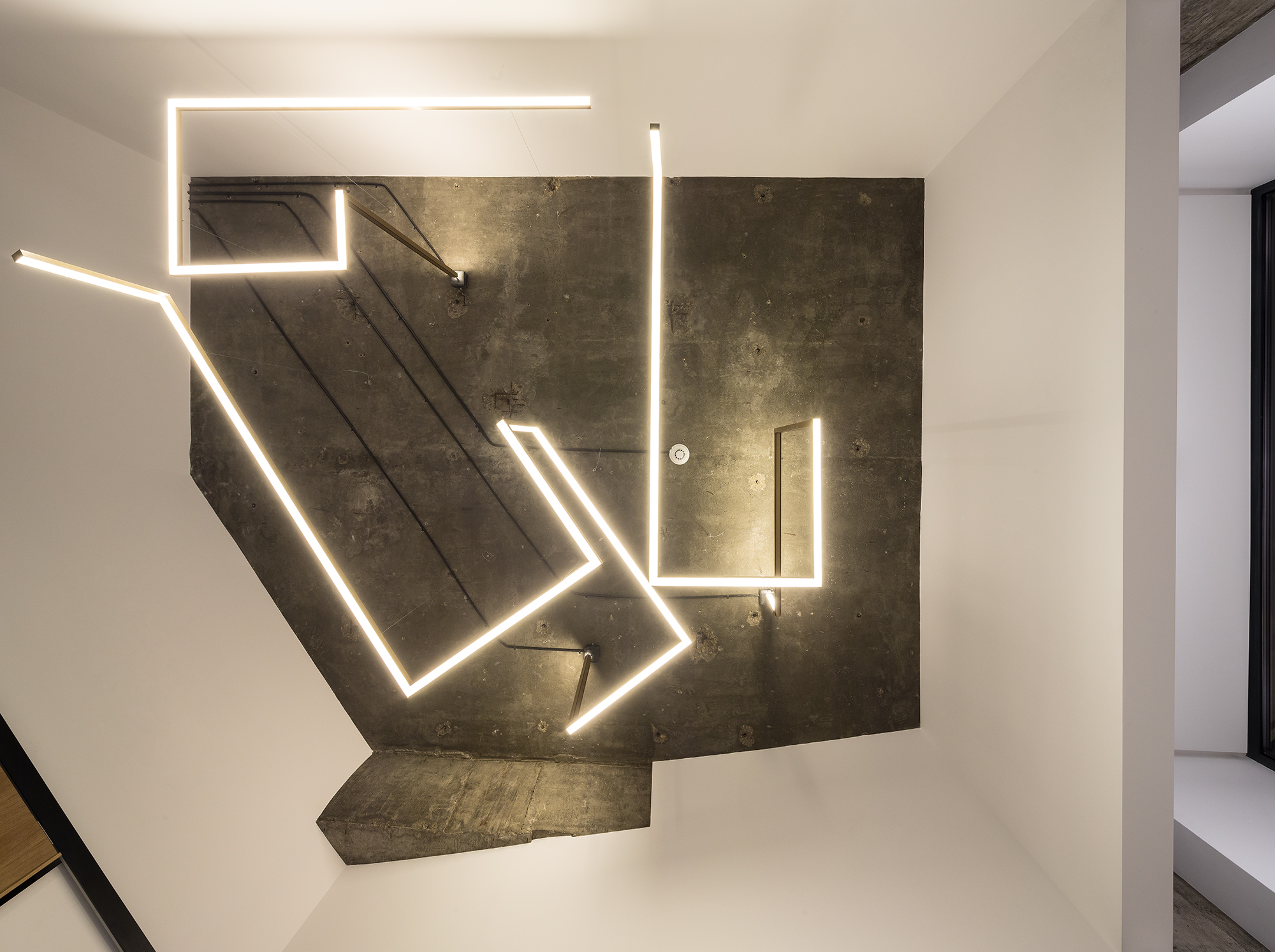 The planimetry of an apartment lacking personality from a block of flats built at the end of the communist period in Cluceru Udricani Street, not far from Unirii Square in Bucharest, proved to be flexible enough to accommodate the new program of a law firm appreciating identity through expressive design. The aspect of functional transformation is less important. From a central reception area, distribution is provided to the partnersʼ office, associatesʼ office, conference room with 6-8 seats and service spaces. The essential focus of spatial planning aimed at a “deconstruction” of the initial rigid and compact space.Obliquity begins as a spatial theme of directing customer gaze in the reception area.