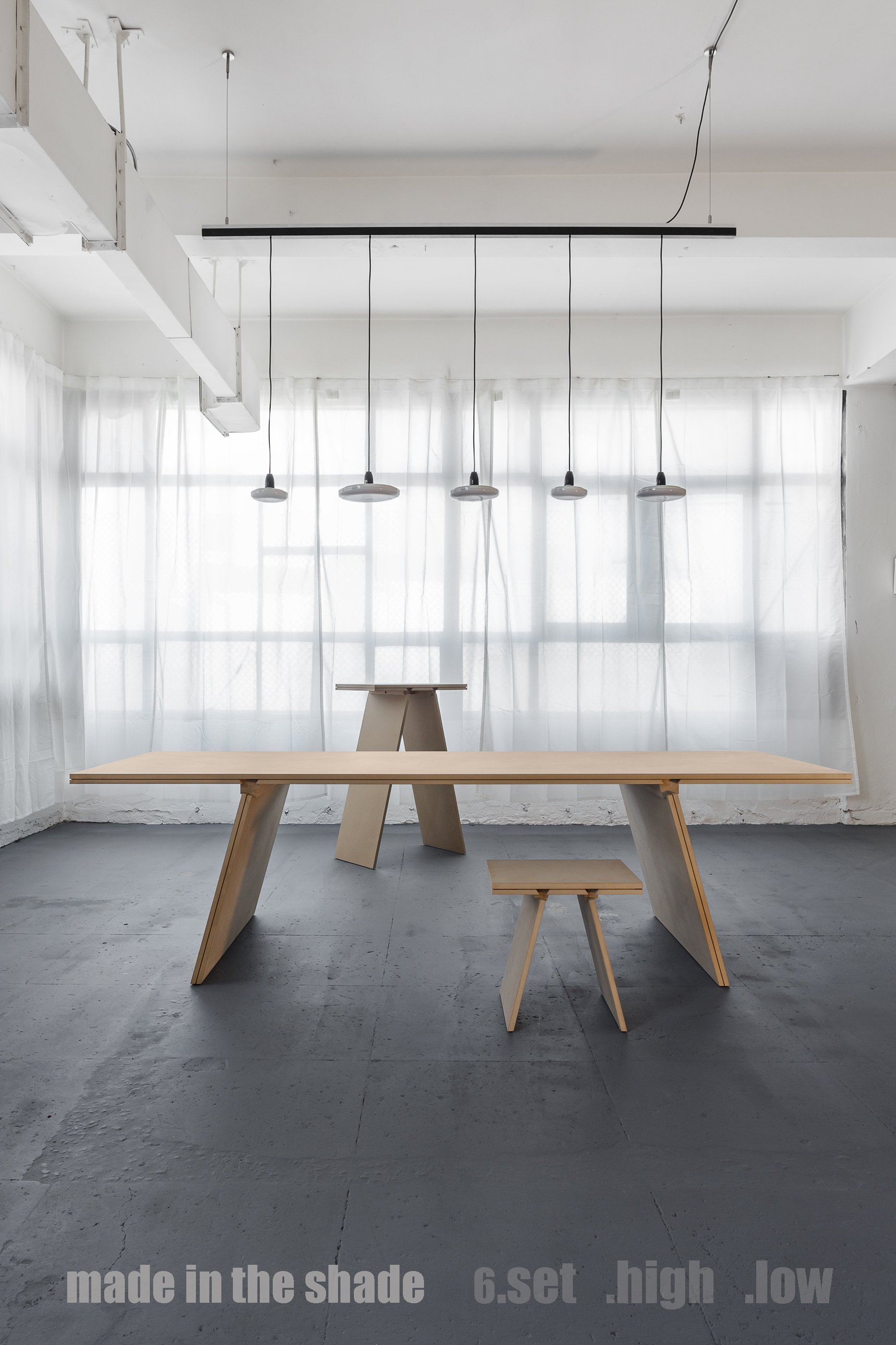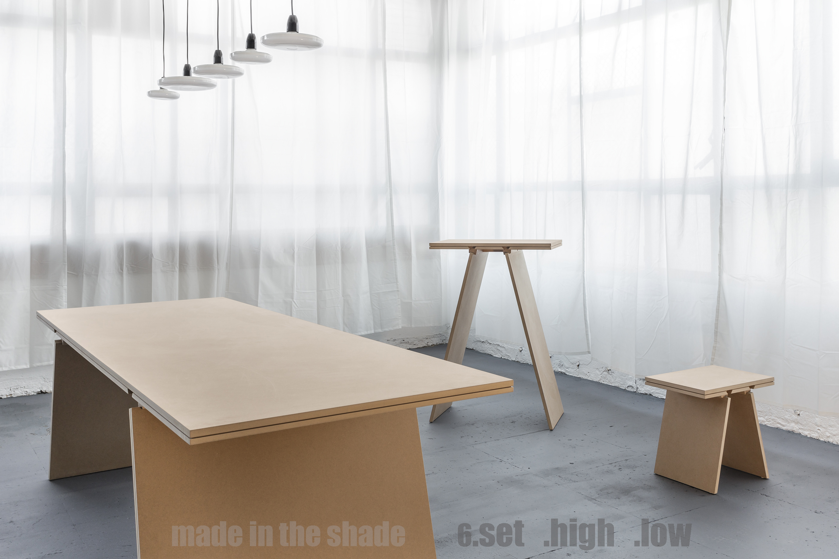 The MADE IN THE SHADE collection is made up of a series of tables, with different functionalities, such as a 6-seat dining table, a high table (bar-type) and a stool.