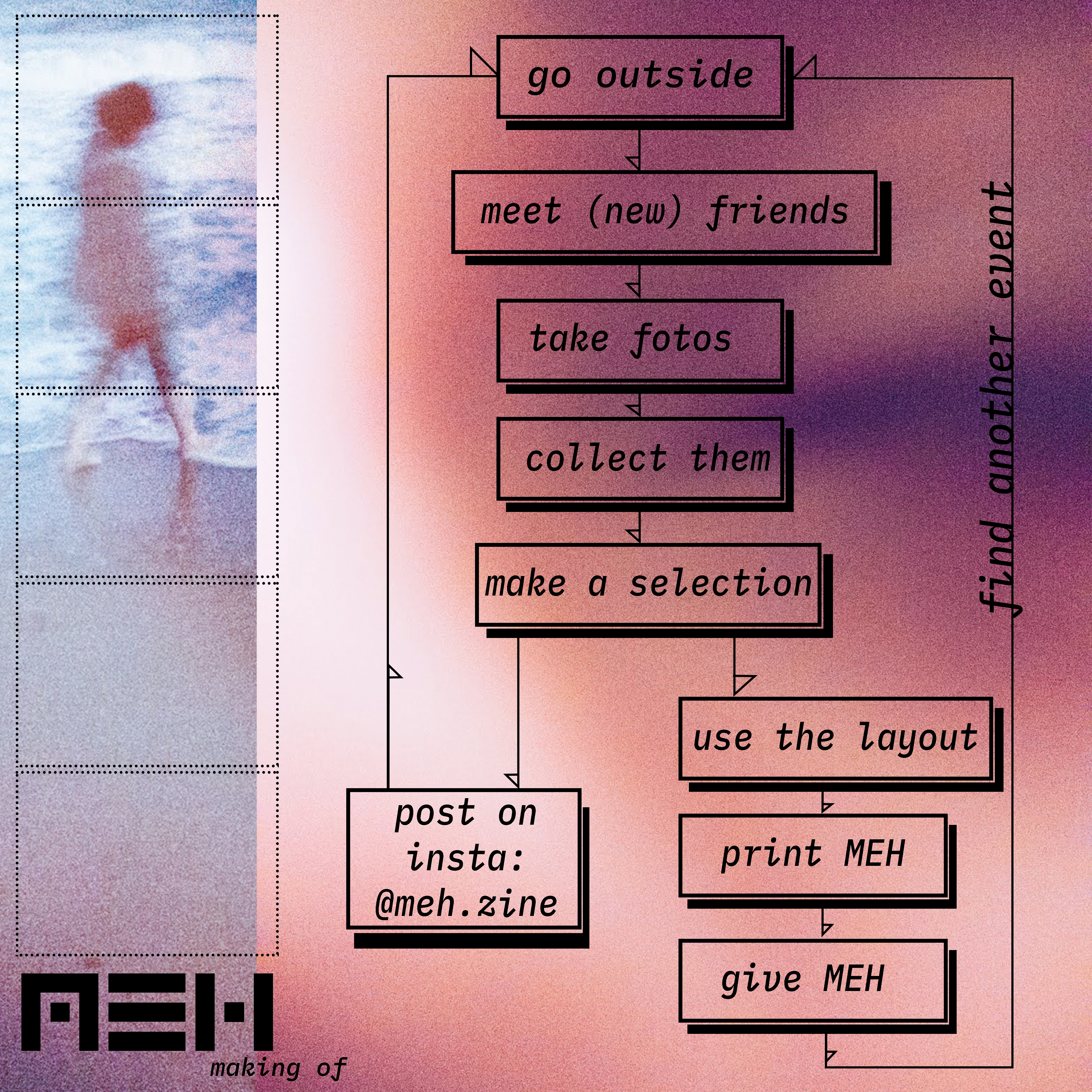 MEH zine, the photographic sketchbook is a recurring publication among friends. It contains collective memories centered around places in a pocket-size format. Each volume/episode presents a place or an event from the pictures of those present.