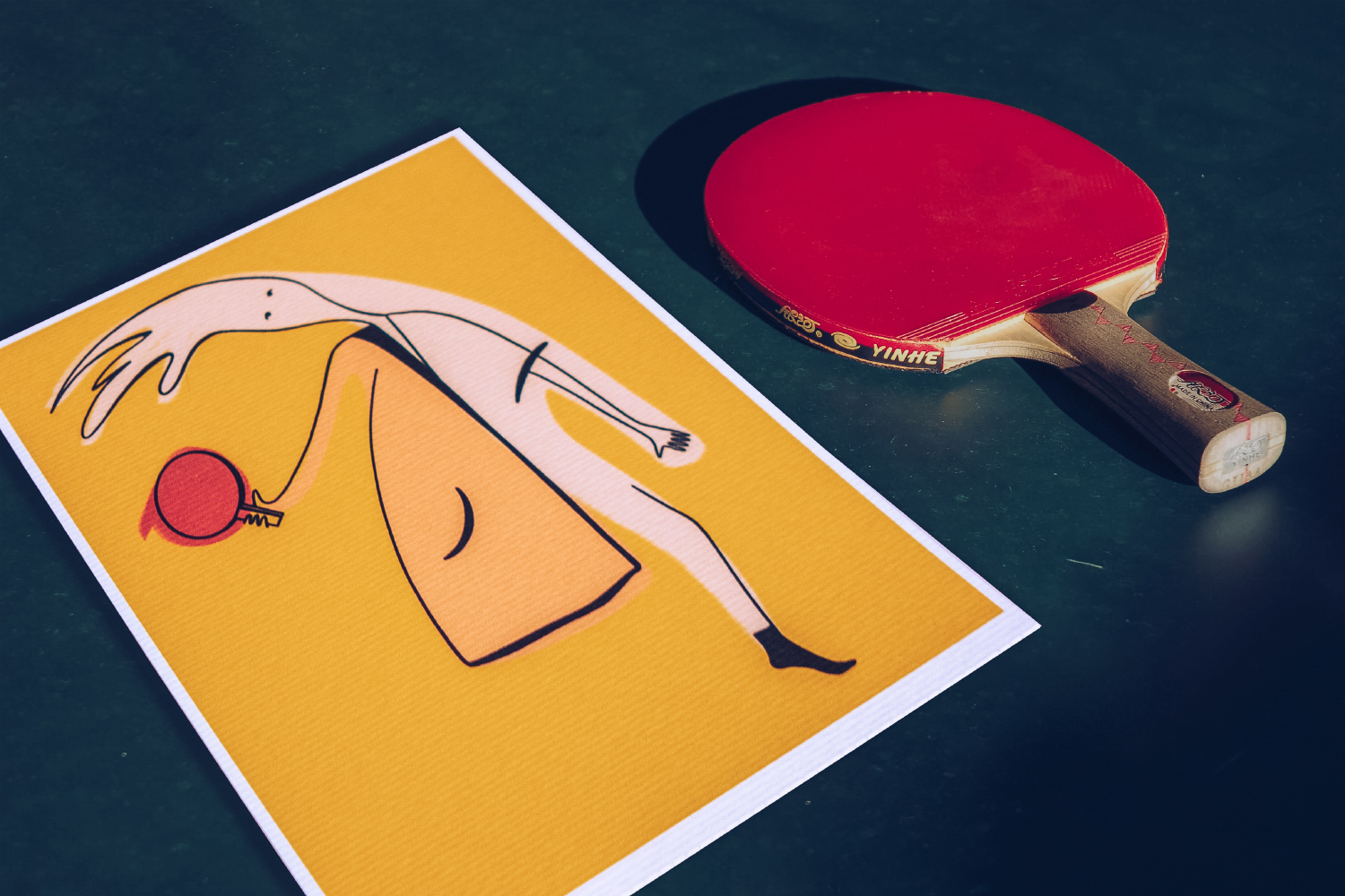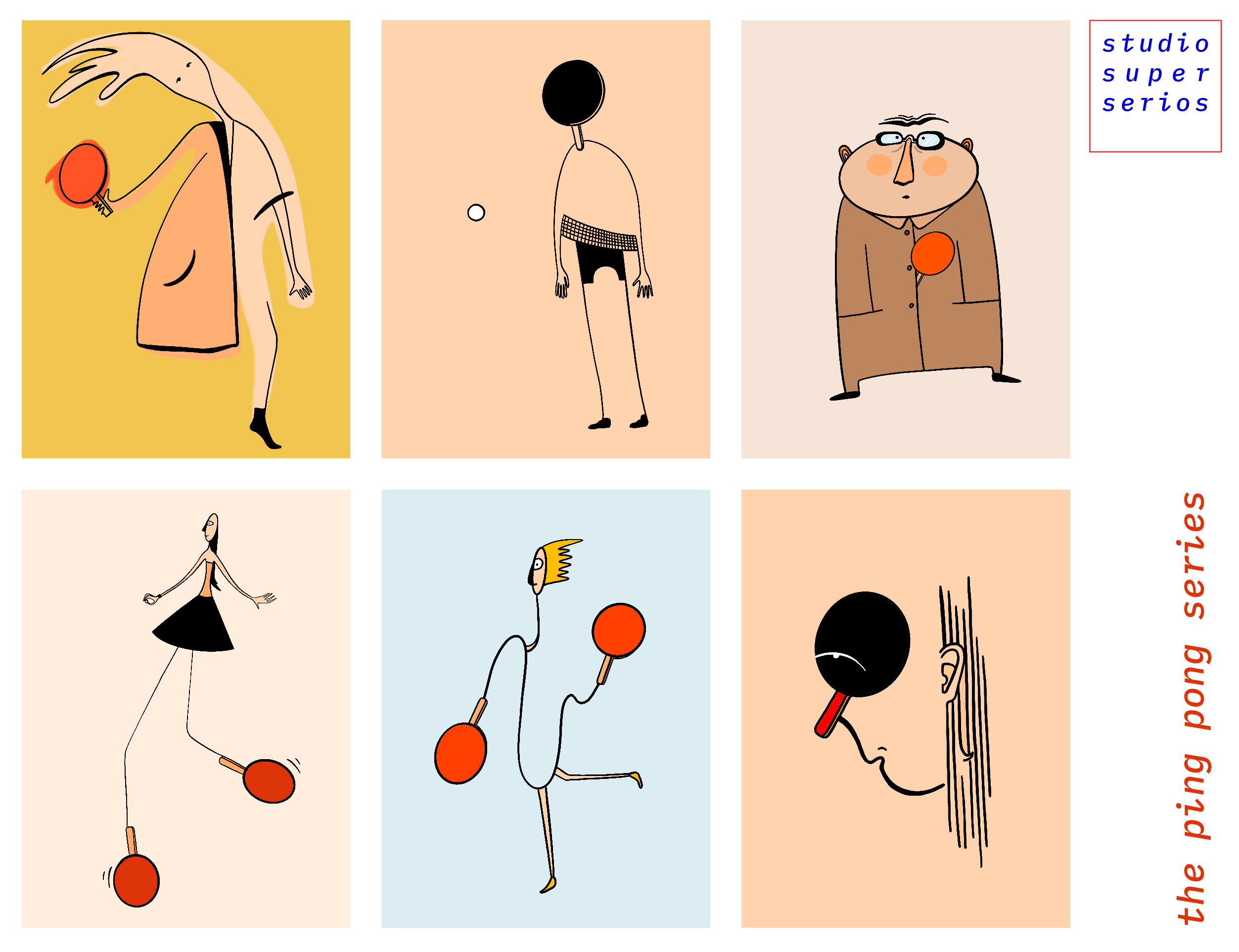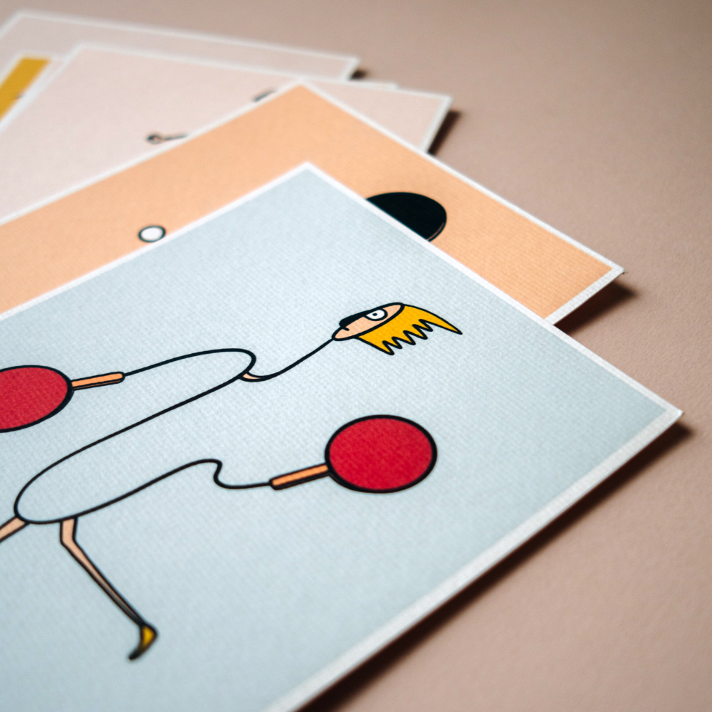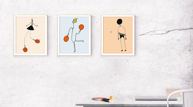 The ping pong pallet becomes, in these illustrations an extension of the human body, sometimes the hand, sometimes the leg or even the head, exposing it as a game for the whole body.