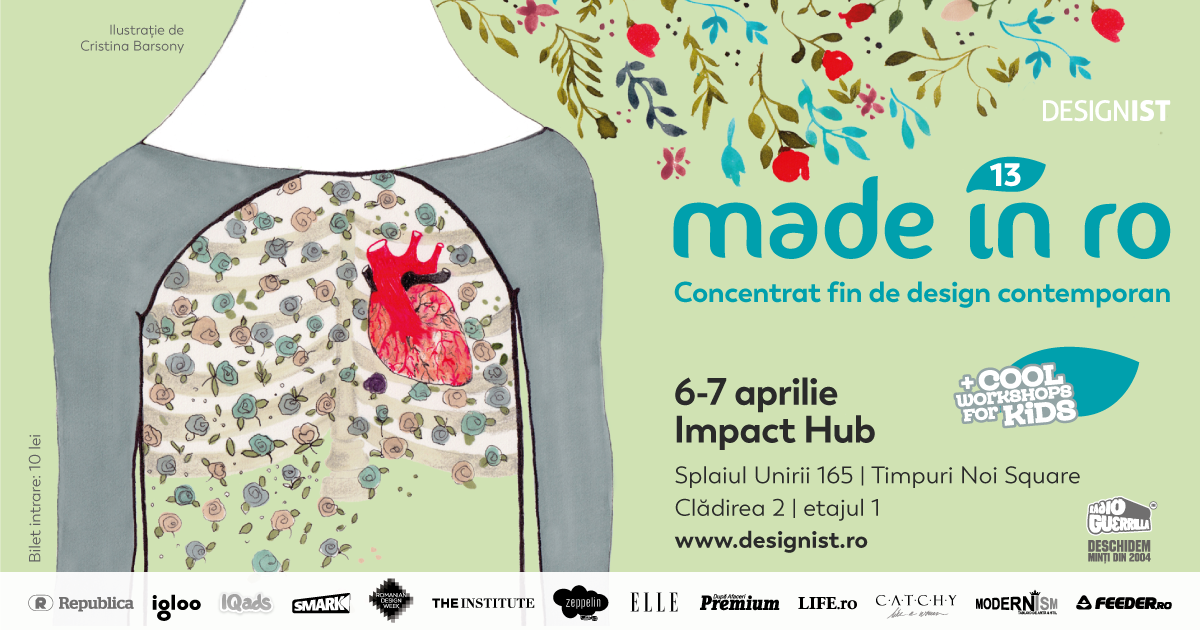 Continuăm la Made in RO #FlowerPower seria Cool Workshops for Kids. Pe parcursul celor două zile de târg, Designist.ro pune la cale, împreună cu oameni talentați, profesioniști recunoscuți în domeniile lor, șase workshop-uri pentru micii creativi, pe teme de design și arhitectură, ilustrație, colaj, joc și fashion design. Copiii au ocazia de a-și cultiva talentul sau de a-l descoperi, de a învăța prin joc, de-a inventa și a construi – toate acestea, într-un context care le permite să interacționeze direct cu designerii și creatorii care expun în cadrul evenimentului. Pe scurt: vreme de o oră, chiar și o oră și jumătate, copilul tău se distrează și învață, iar tu vizitezi standurile designerilor selectați la Made in RO #13.
