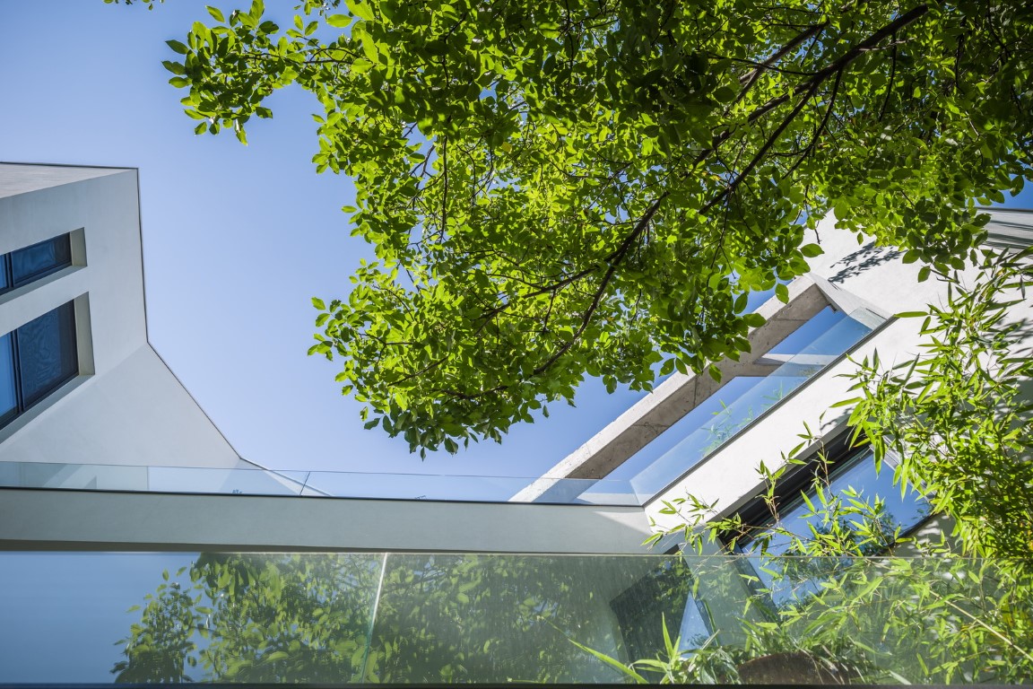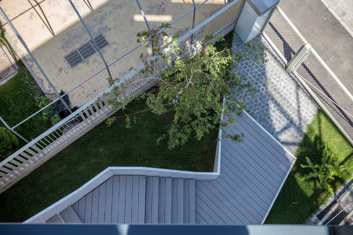 On the South-East face, which faces the street and has plenty of windows, a shadowing system was formed by a metal structure and stainless steel netting filled with crawling vegetation (existing ivy) In the balcony built-in pots 1.5 meter shrubbery will be planted.
