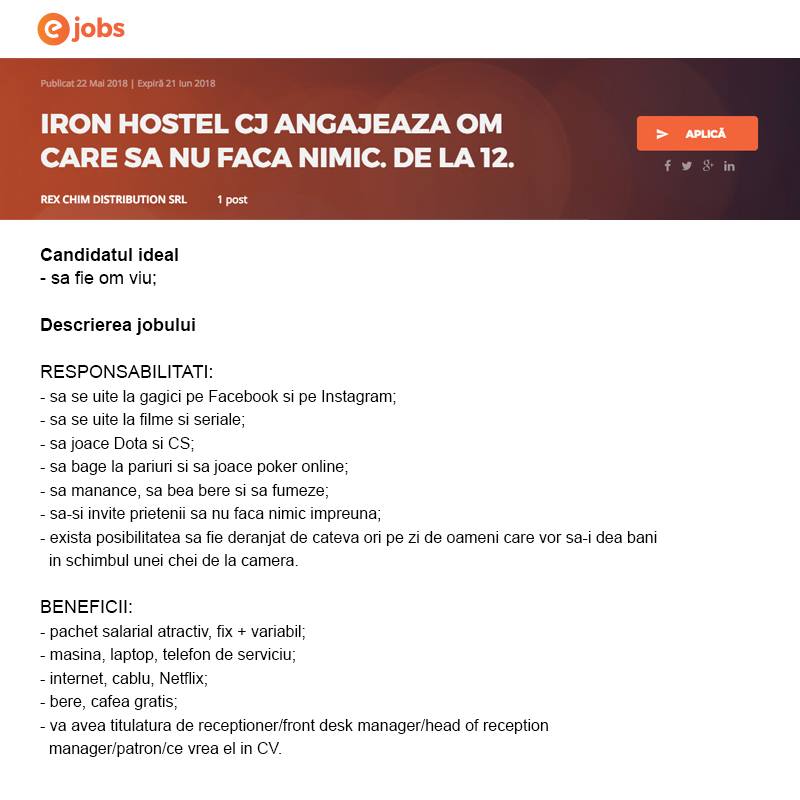 Paid to do Nothing – de la Cake pentru Iron Hostel, un anunț de angajare care a circulat recent în online și a atras atenția tuturor. Job description-ul pentru munca ideală le aparține lui Arpad Peter (Art Director) și Cătălin Marian (Copywriter).