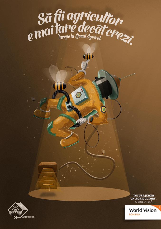 Pe locul 3 se află o serie de printuri semnate de o echipă freelance pentru World Vision. Încurajează un agricultor este un proiect care își dorește să promoveze înscrierile la Liceul Agricol și să scoată în lumină o ocupație încă necesară și relevantă. Echipa de lucru este formată din Ioana Gheorghiță – Brand Strategist, Mihai Costache - Senior Copywriter și Adrian AGI Ioța - Senior Art Director / Ilustrator.