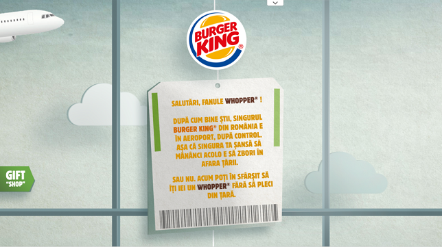 Așadar, în aprilie cunoaștem premianți ai categoriilor de TV, Outdoor, Digital şi Experiential / BTL, dar și care este lucrarea lunii - Burger King - Whopper No-Show. Lucrarea care a primit cel mai ridicat punctaj este semnată de Publicis România și propune o soluție profund creativă pentru fanii Burger King. Singurul restaurant din România se află în aeroport, după punctul de control, așa că Burger King împreună cu Vola au fixat 6 pași simpli prin care pofta nu-ți va mai depăși granițele: Cumperi un bilet low cost, îți faci check-in-ul, te duci la aeroport și treci de control, ajungi la Burger King, arăți boarding pass-ul la casă, primești un meniu Whopper. Echipa care a lucrat pe proiect: Vlad Socianu – Art Director & Ruxandra Drilea – Copywriter.