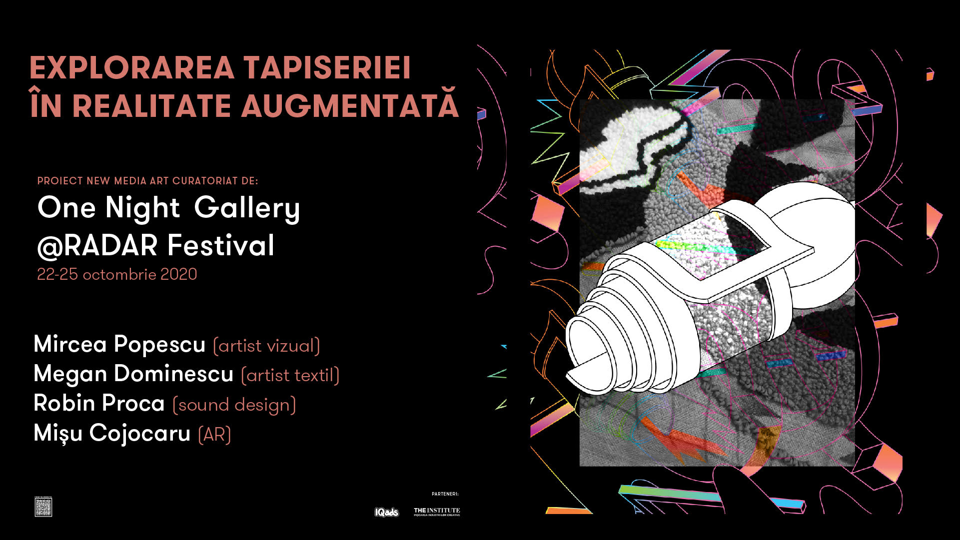 Artistul vizual Mircea Popescu, alături de artista textilistă Megan Dominescu, cărora li se alătură Robin Proca (sound design) și Mișu Cojocaru (AR, parte din echipa One Night Gallery) vor prezenta publicului o tapiserie în realitate augmentată în cadrul expoziției temporare de artă RADAR (Romanian Artists Developing Alternative Realities), ce va avea loc la ROMAERO, între 22 – 25 octombrie.