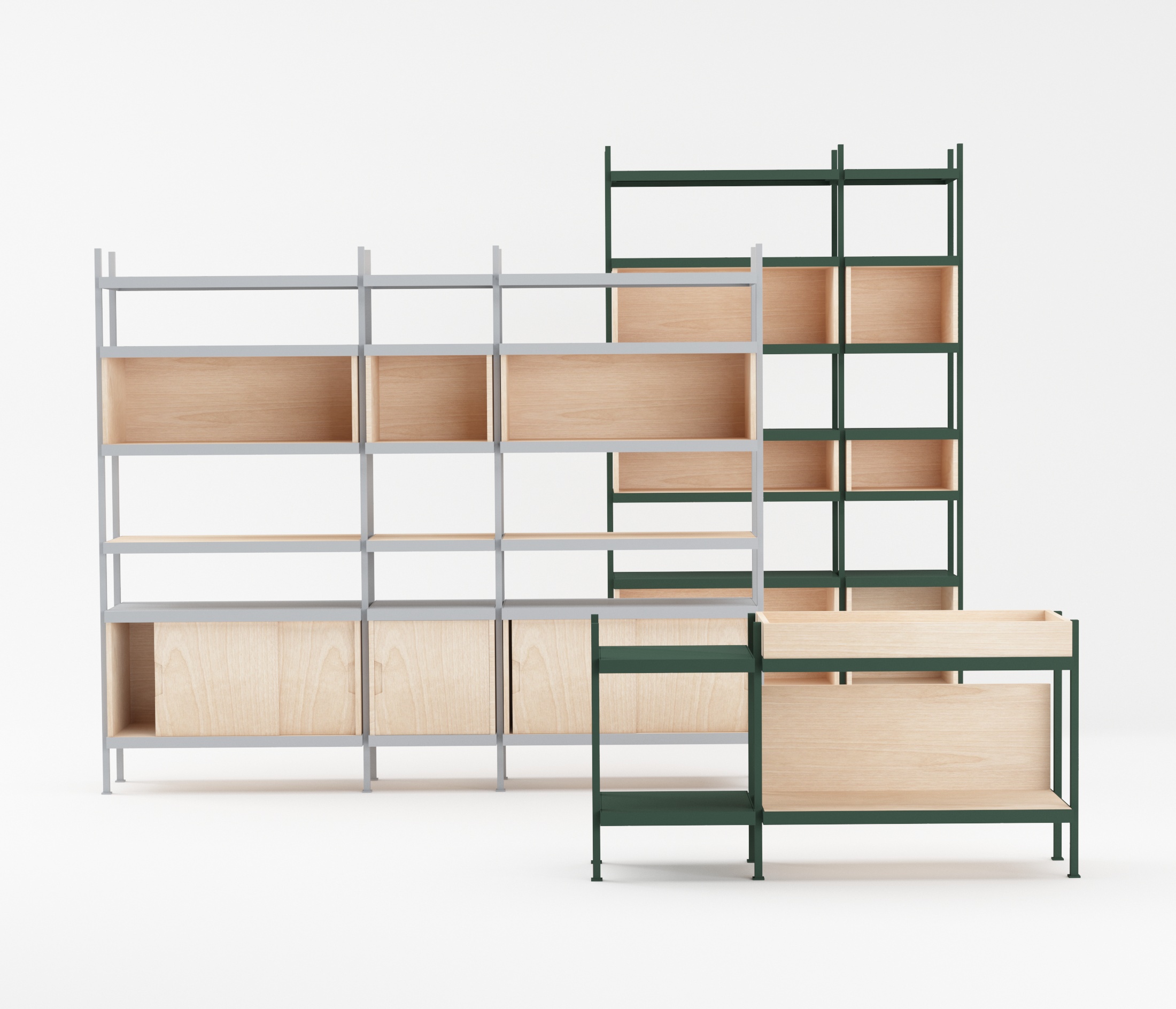 Drawing inspiration from the shelves used in industrial storage this system offers modularity in vertical and horizontal directions, giving freedom of choosing from sixteen types of shelves, various vertical dimensions and color combinations.