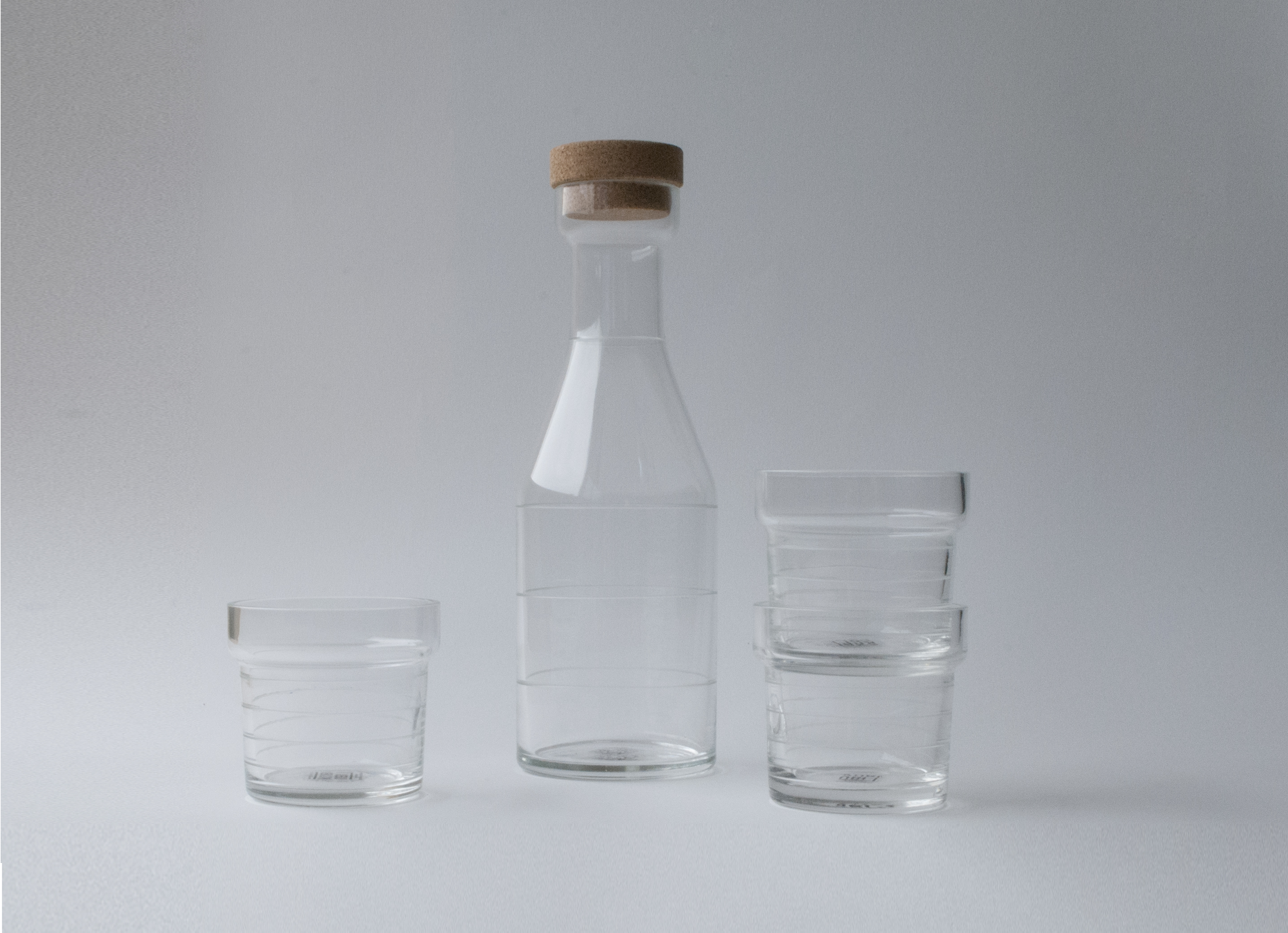 Drinking water from a carafe has more to do with the pleasure of the gesture and with having better control over the amount of water we drink than it has to do with the need itself. We tried to improve the bottle from an ergonomic perspective by making the neck of the bottle longer, making it easier to handle without altering too much the "iconic" shape. The engraved horizontal lines mark the amount of water in the recipients.