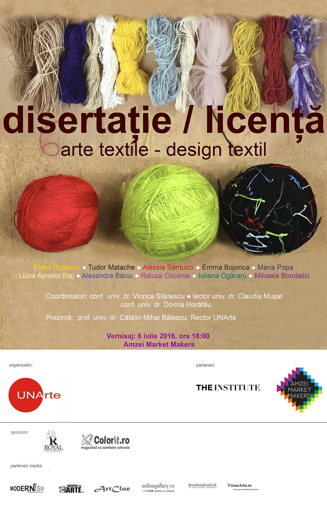 Ansamblul expoziţional Disertație/ Licență/Arte textile - Design textil prezintă lucrări de master si licenţă, teme de studiu şi proiecte de cercetare în arta fibrei, în care studenţii absolvenţi caută moduri personale de a exprima idei, propun teme care pun accent pe contribuţie personală originală, creativitate, investigare, interpretare şi experiment novator. Evenimentul expoziţional universitar este organizat şi coordonat de conf. univ. dr. Viorica Slădescu, conf. univ. dr. Dorina Horătău şi lect. univ. dr. Claudia Muşat. Deschiderea expoziţiei, care va avea loc miercuri, 6 iulie, va fi marcată de cuvântul prof. univ. dr. Cătălin Mihail Bălescu, Rector al Universităţii Naţionale de Arte, Bucureşti.