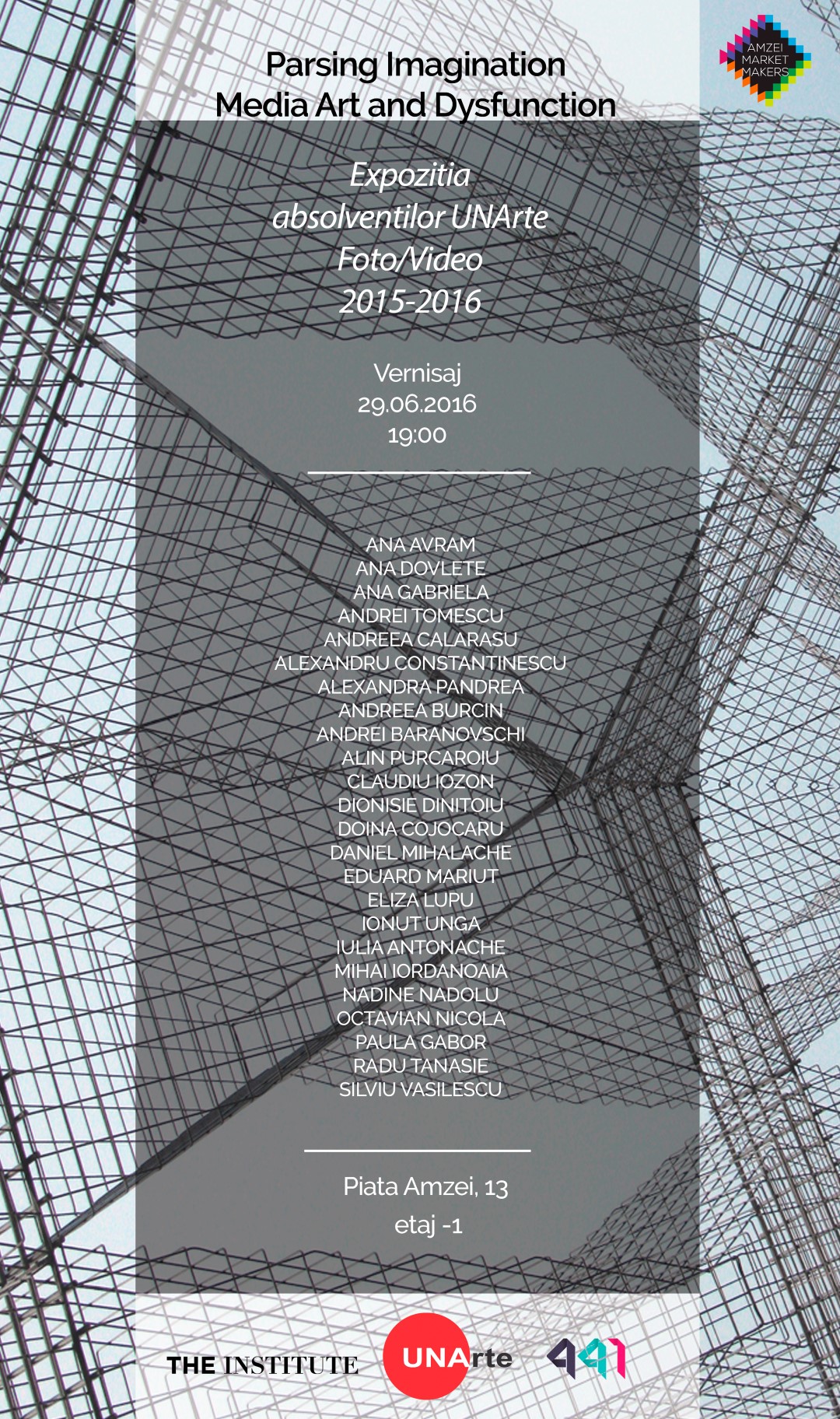 "Parsing Imagination: Media Art and Dysfunction", expoziția absolvenților Foto-Video ai Universității Naționale de Artă București, promoția 2015/2016, prezintă lucrări și proiecte dezvoltate de: Ana Avram, Ana Dovlete, Ana Gabriela, Andrei Tomescu, Andreea Călărașu, Alexandru Constantinescu, Alexandra Pandrea, Andreea Burcin, Andrei Baranovschi, Alin Purcăroiu, Claudiu Iozon, Dionisie Dinițoiu, Doina Cojocaru, Daniel Mihalache, Eduard Măriuț, Eliza Lupu, Ionuț Unga, Iulia Antonache, Mihai Iordănoaia, Nadine Nadolu, Octavian Nicola, Paula Gabor, Radu Tanasie, Silviu Vasilescu.
