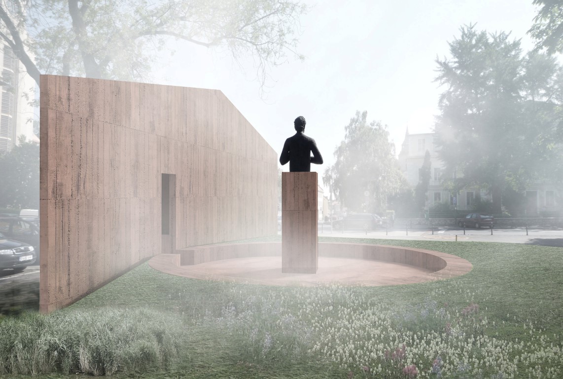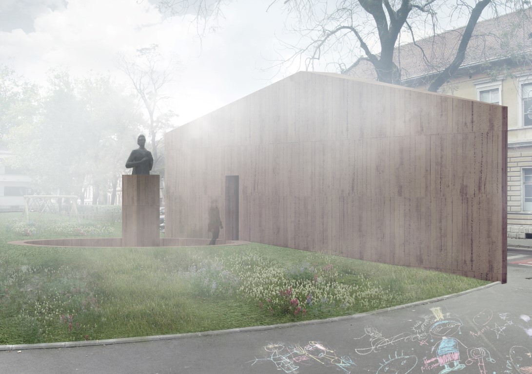 The space around the statue of Ciprian Porumbescu can’t be seen as a separate part, but only as continuation of the park. In this way the starting premises are: continuation of the green area and resolving the proximity with the parking area and the street close to the park. The wall protects the statue from the mess of the parking and the street creating together with the statue a unique scenography and defining in the same time a clear entrance zone in the park. The structural stability of the concrete wall is achieved by adding an extra thickness in the middle of the wall giving a third dimension to it, making this wall become an object. The wall hides in its thickness a small space transforming it from a simple object into architecture. I theI the middle of the green area, a concrete ring enclose a contemplation space around the sculpture.