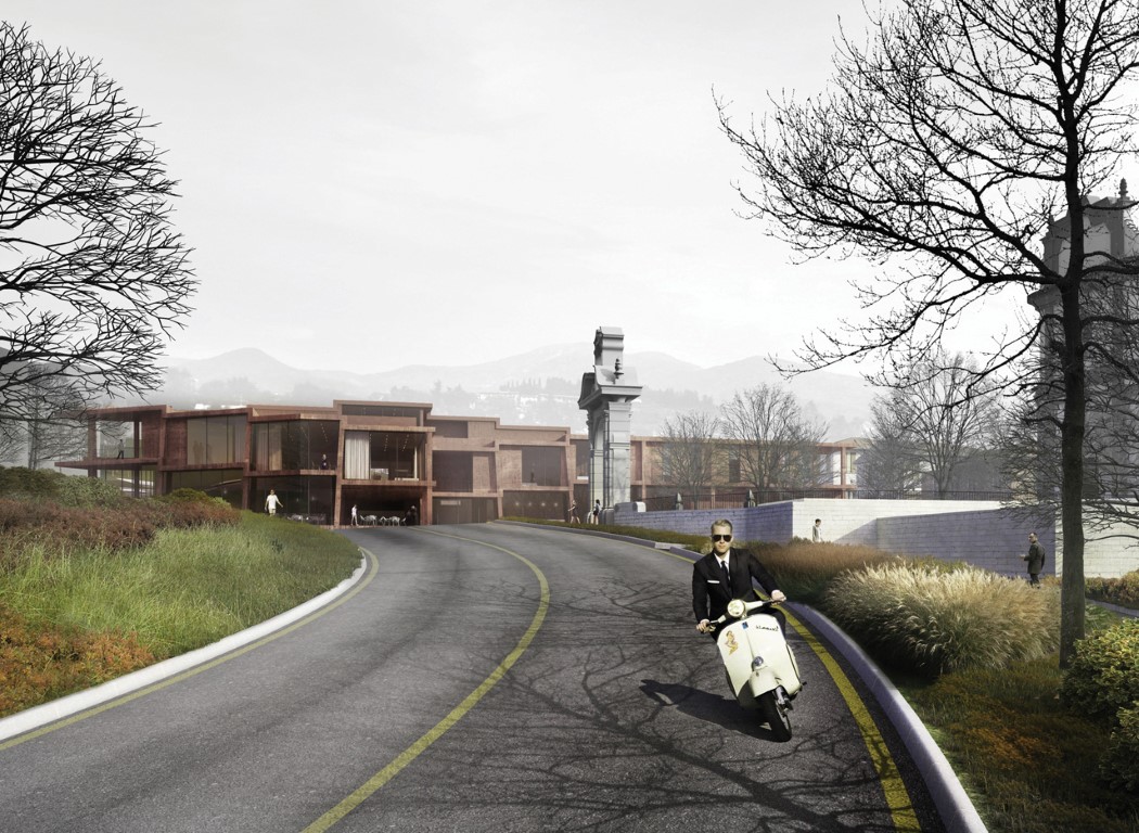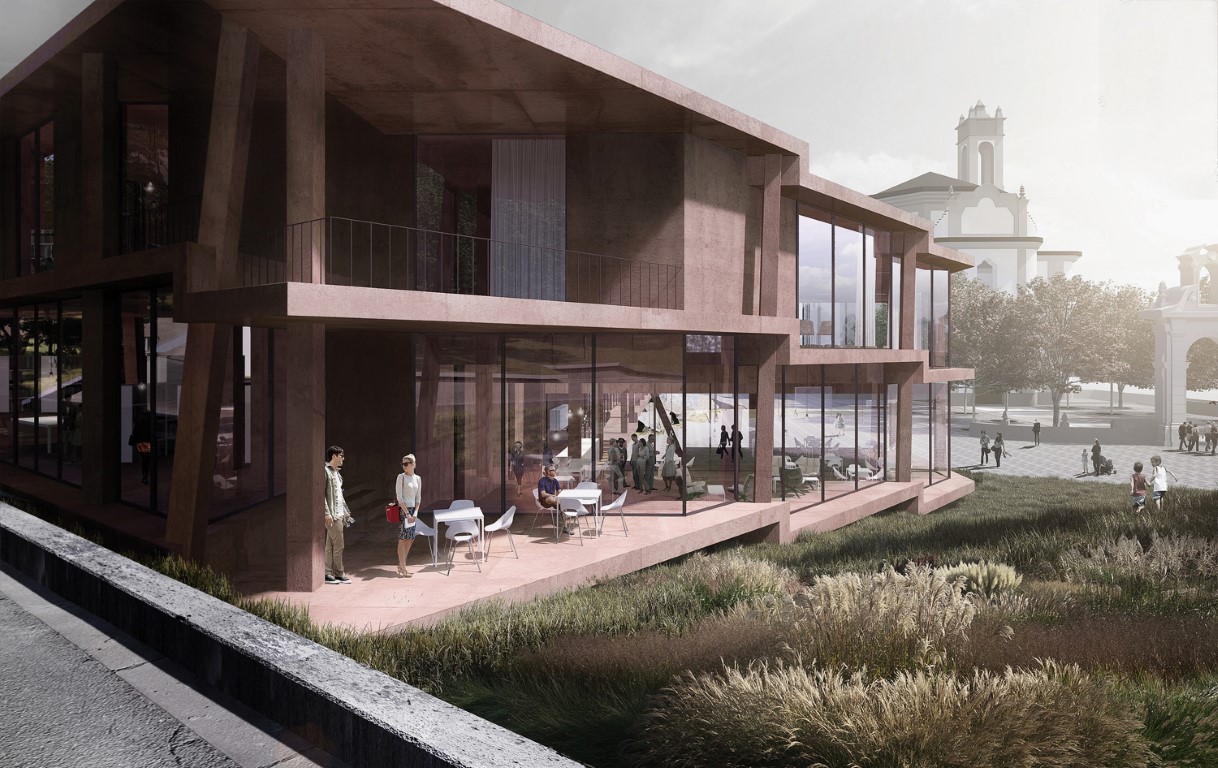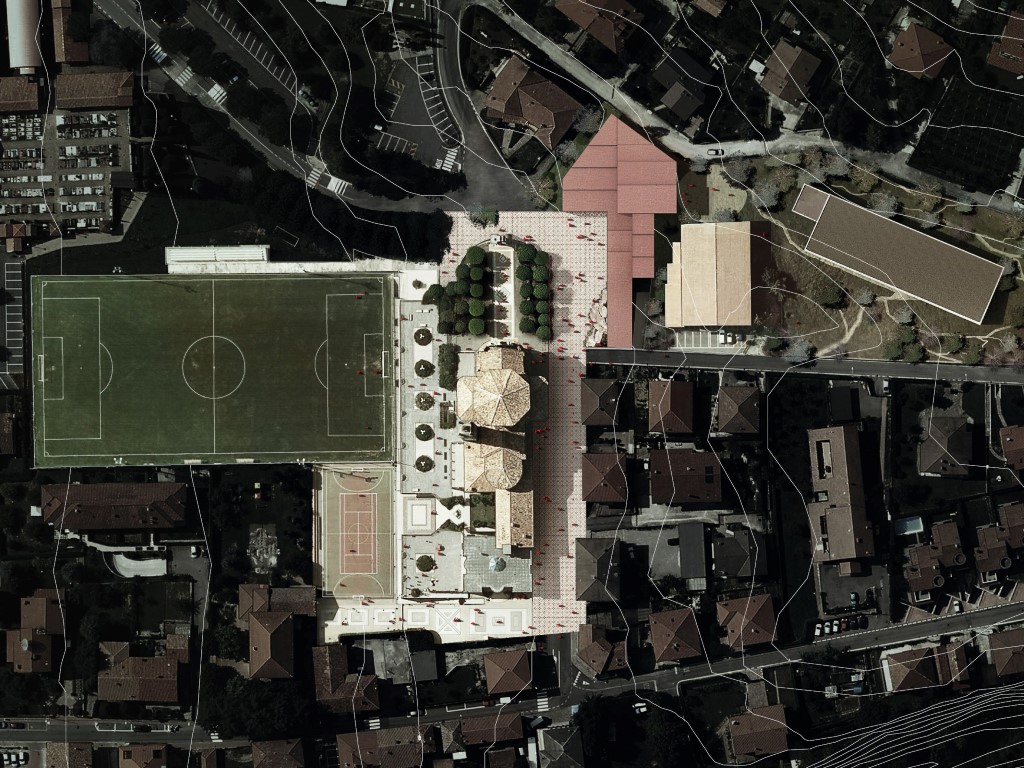 As an answer to the competition topic, they’ve imagined a new public center for the village of Cenate Sopra, Italy. Due to severe surface limitation, their first action was to occupy as much as possible of the buildable area in order to cut out the biggest unnecessary surface. Together with the existing public space of the church and the street, the resulted space would gain the character of a generous and authentic piazza. Given the complex topography of the site and the position of important focusing points like the school, piazza and the church, the new building is developed as a system of platforms that follows the existing terrain and organises the program in a strategic manner. As a result, the new building creates a continuous flowing space made of platforms and pillars. The structure takes advantage of the stair-like system and uses the step as a beam, resulting in an ingenious and simple structural system. Due to its apparently deformed anatomy and its red colour given by the concrete’s pigmentation, the building gains the character of a huge resting animal between the heels of Cenate Sopra.