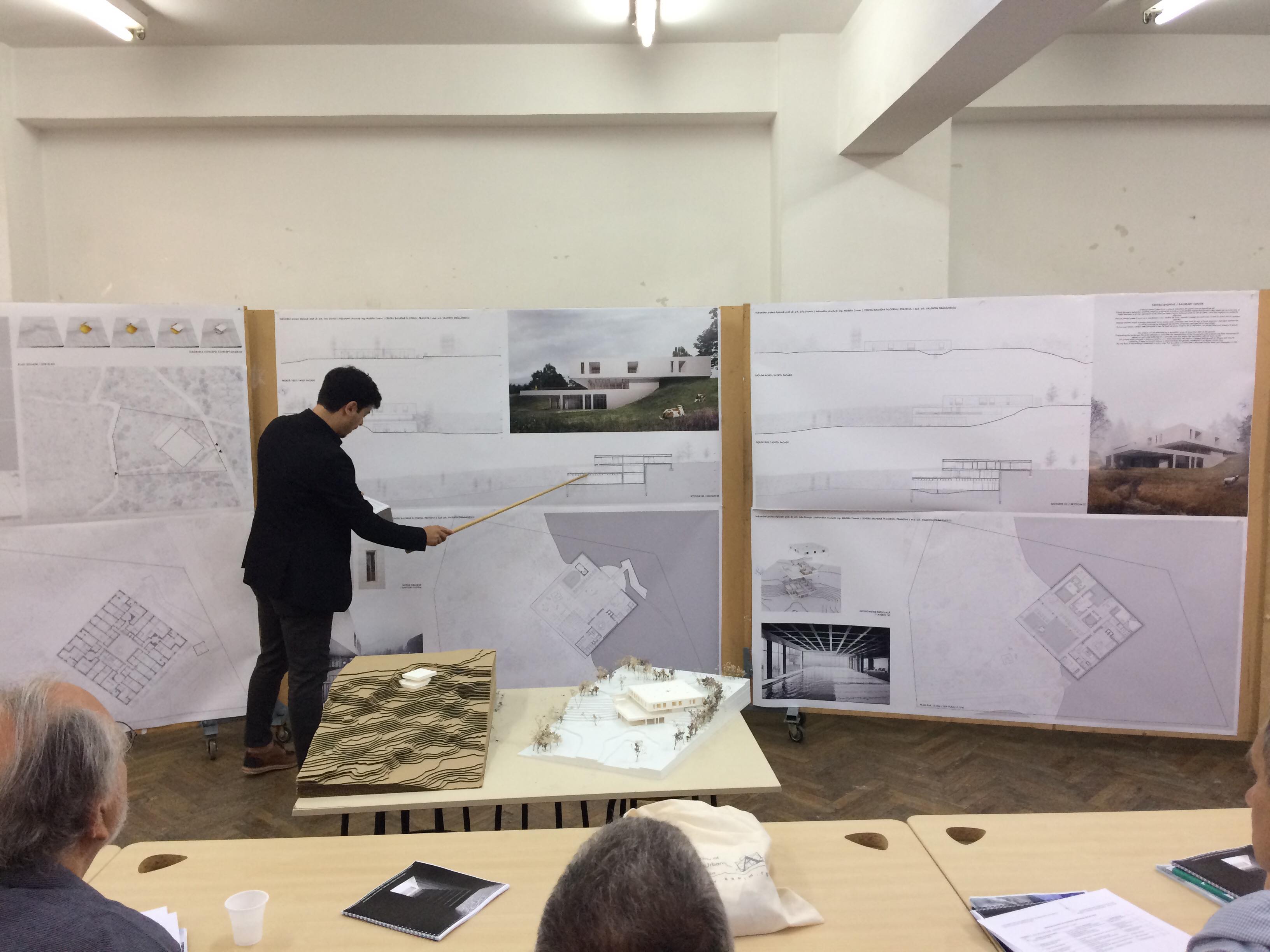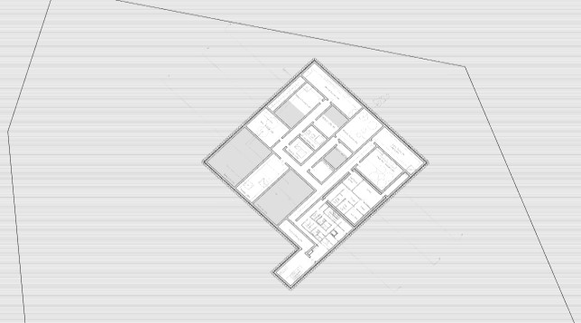 Ținând cont de topografia terenului, în special de crevasa parcă sculptată în peisaj, dar și renunțând la primul impuls de a săpa masiv în teren, spațiul contruit înțelege și împrumută din caracteristicele apriori ale peisajului. Astfel, prima parte a volumui se așează, își face loc pe pământ și vine ca o completare a bucății lipsă. Partea superioară, acest lintou tectonic, coboară peste baza solidă, nu o atinge, ci rămâne într-un echilibru, într-un repaus aparent.