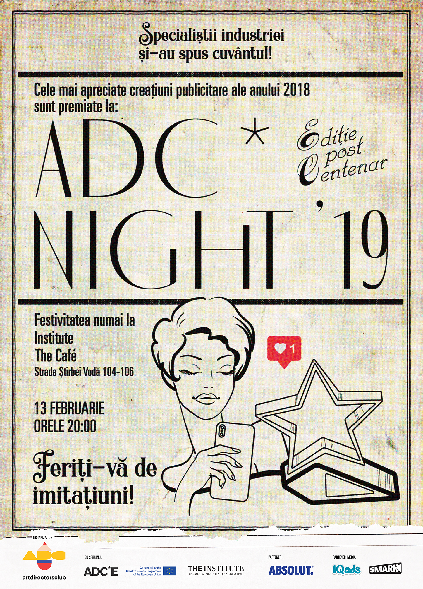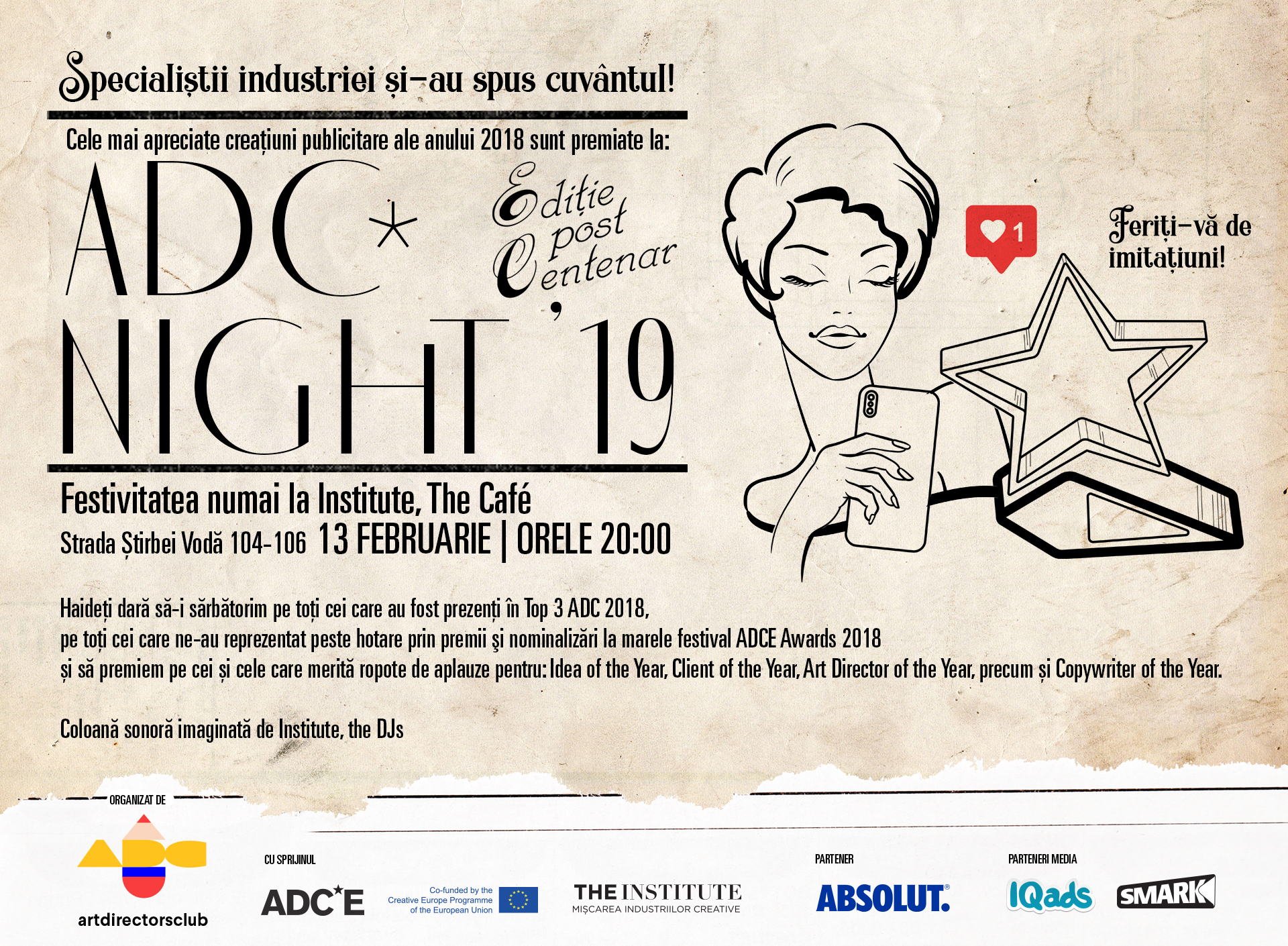 ADC Night 2019 presents on 13th of February the third edition of the annual Top 3 ADC*RO awards. We’ll celebrate with every agency and campaign present in Top 3 ADC 2018 and with the agencies which in 2018 represented Romania at ADCE Awards. ADC Night will take place at Institute The Café, starting 8 PM.