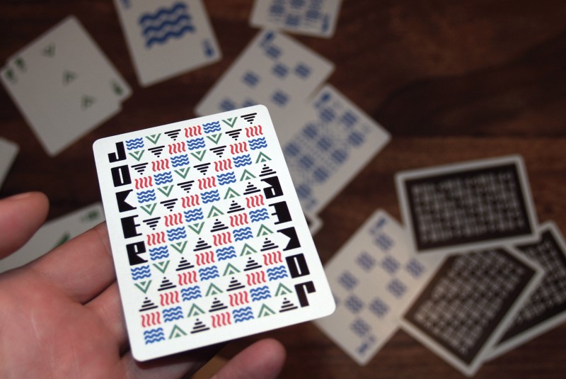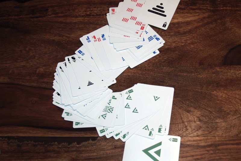 The four suits find their meaning in nature – green in the earth, red in the fire, black in the wind and blue in the deep pure water, each one illustrating a different experience on playing outdoors, with natural elements.