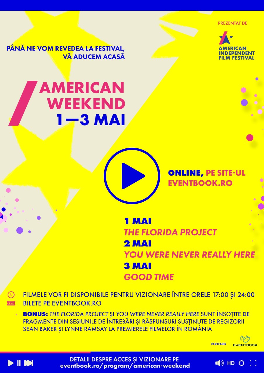 Totodată, pentru fanii filmelor americane, American Independent Film Festival a pregătit un weekend de filme online - American Weekend între 1 si 3 mai, online pe platforma Eventbook.ro. Fiecare film va fi disponibil pentru vizionare între orele 17:00 și 24:00 din ziua în care este programat.