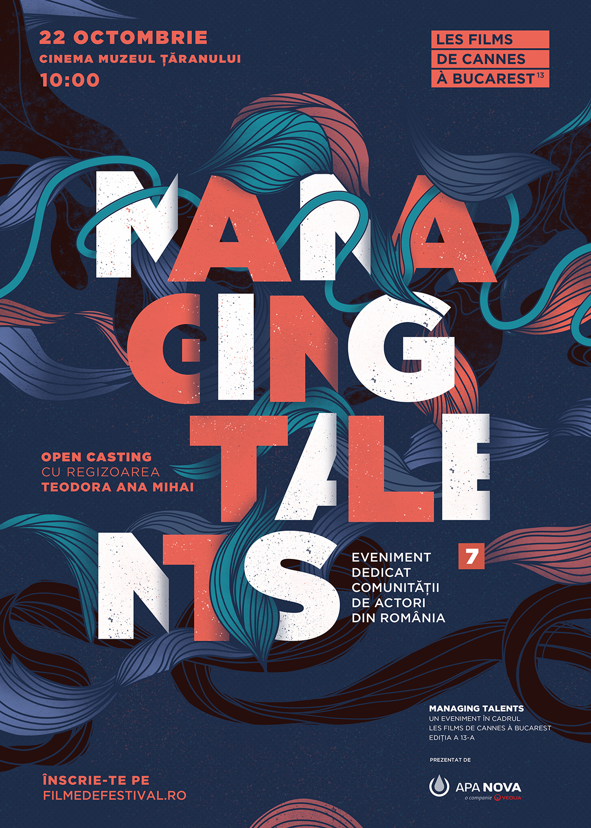 La cea de-a 13-a ediție Les Films de Cannes à Bucarest revine și deja bine-cunoscutul program dedicat comunității actorilor din România – Managing Talents care își propune să le ofere instruire, contacte și să le faciliteze oportunități pentru cariera lor de film, în România dar și în străinătate. În cadrul ediției a 7-a va avea loc un casting deschis în urma căruia vor fi selectați actori pentru rolurile principale ale unui film românesc care va fi turnat anul viitor. Filmul va fi regizat de Teodora Ana Mihai, realizatoare care a fost prezentă în 2021 la Cannes, în selecția oficială, cu primul ei lungmetraj intitulat La Civil, pentru care a fost distinsă cu Prix de l’Audace în Un Certain Regard.