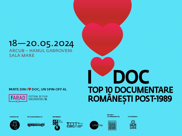 Seria de proiecții și discuții I ❤ DOC – Top 10 cele mai bune documentare românești post-1989 are loc la ARCUB – Hanul Gabroveni, Sala Mare în perioada 18-20 mai, iar calendarul evenimentului este cel de mai jos: