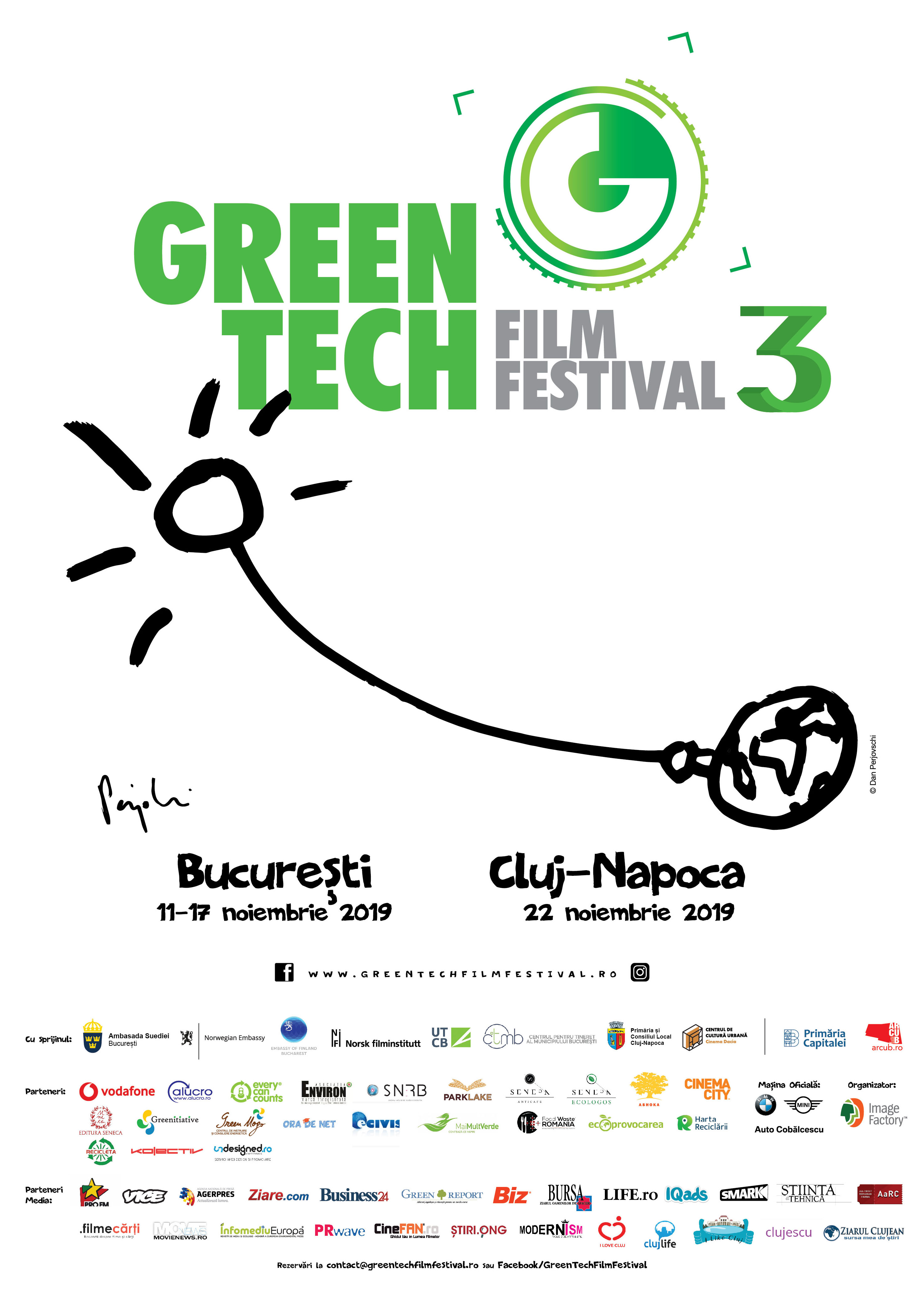 GreenTech Film Festival - platforma de educaţie care promovează stilul de viaţă sustenabil, grija faţă de mediu şi tehnologiile verzi existente, prin filme documentare, dezbateri, ateliere şi expoziţii revine în luna noiembrie 2019 cu o nouă ediţie dedicată publicului din Bucureşti şi Cluj-Napoca. Evenimentele incluse în programul celei de-a treia ediţii de la Bucureşti se desfăşoară în perioada 11-17 noiembrie, în locaţiile ParkLake Shopping Center (zona Main Square şi Cinema), ARCUB (Sala Mare) şi Seneca Anticafe. Acestea vor fi urmate de o ediţie specială organizată în Cluj-Napoca, la Cinema Dacia, în ziua de vineri, 22 noiembrie.