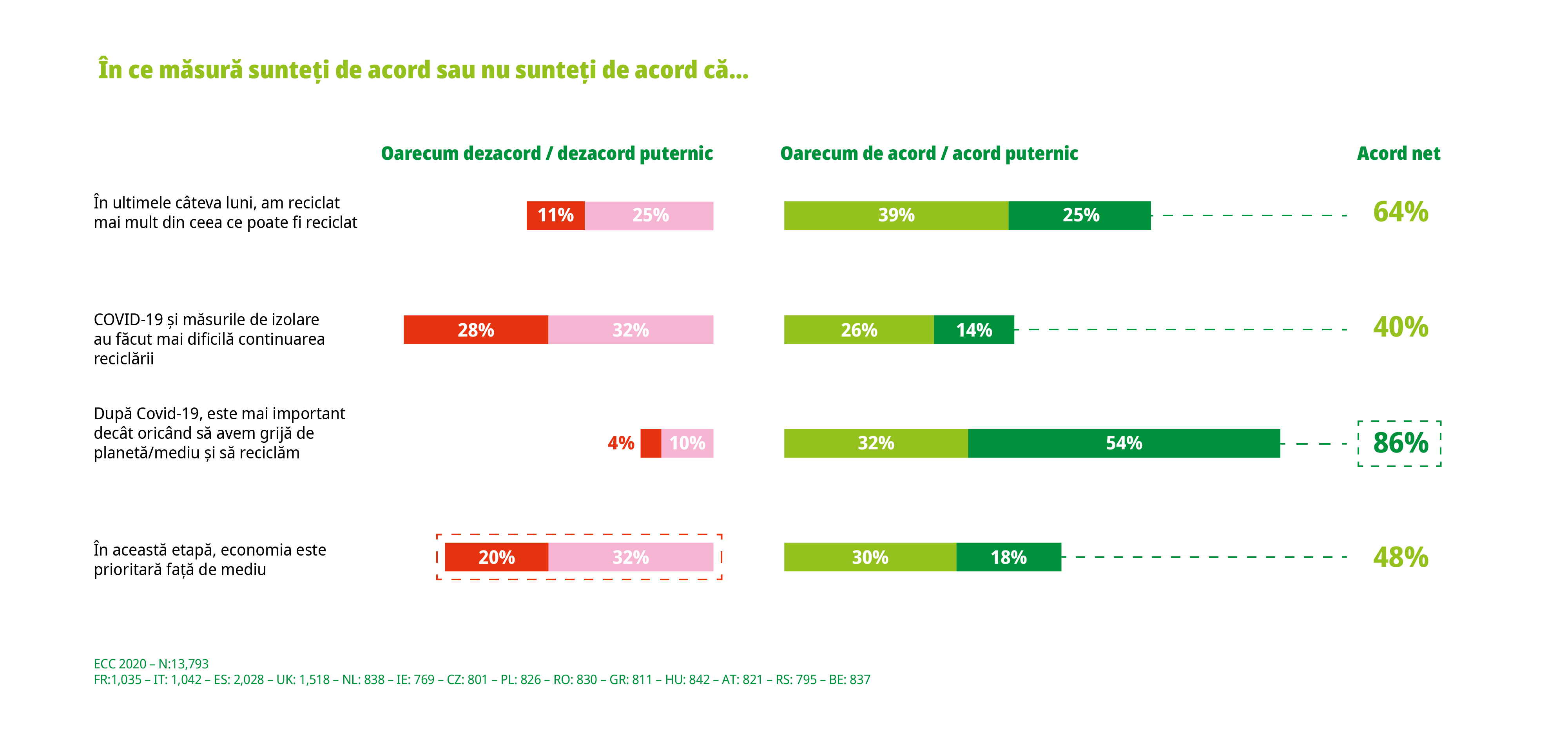 La nivel local, 94% dintre respondenţii din România au spus să este mai important ca niciodată să avem grijă de planeta noastră, după COVID-19, în timp ce97% declară că vor să facă mai mult când vine vorba de reciclare. Mai mult, 56% au declarat că ar pune problema mediului mai presus de economie, ceea ce arată o clară schimbare de priorităţi.