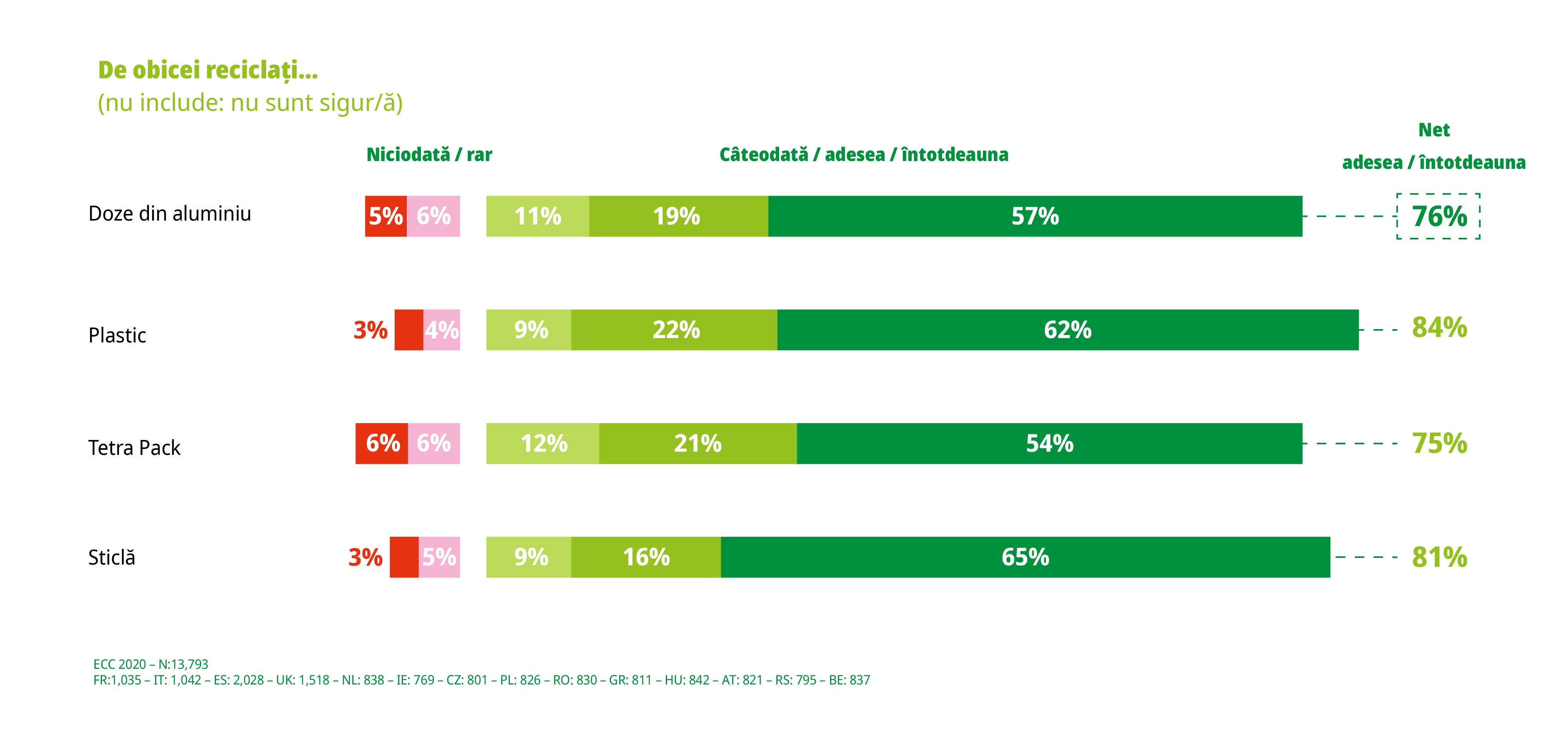 Potrivit unui studiu efectuat în 14 ţări europene de agenţia de cercetare LUCID, în asociere cu Every Can Counts, iniţiativă care are scopul de a creşte gradul de conştientizare asupra avantajelor reciclării dozelor din aluminiu, 86% dintre europenisunt de părere că este mai important ca niciodată să avem grijă de mediul înconjurător şi să reciclăm, după COVID-19, în timp ce un procent covârşitor de 91% au spus că ar vrea să facă mai mult.