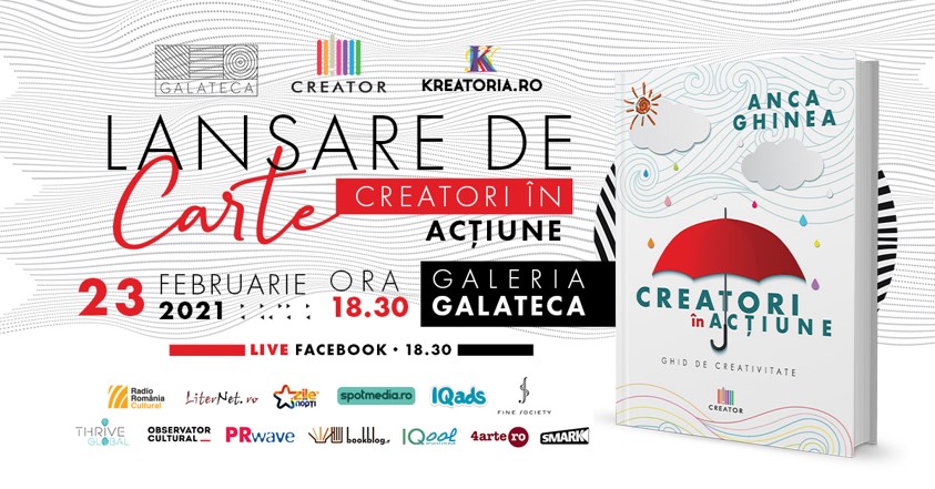 Ce faci concret când inspirația întârzie și ai de predat un proiect? Dar când trebuie să schimbi abordarea și simți că nu ai resurse? Este creativitatea ceva ce poate fi controlat? La aceste întrebări și la multe altele răspunde Anca Ghinea, jurnalist și fondatoarea Kreatoria.ro, trainer, în cartea „Creatori în acțiune”, a cărei lansarea va avea loc pe 23 februarie, de la ora 18:00, la galeria Galateca din București.