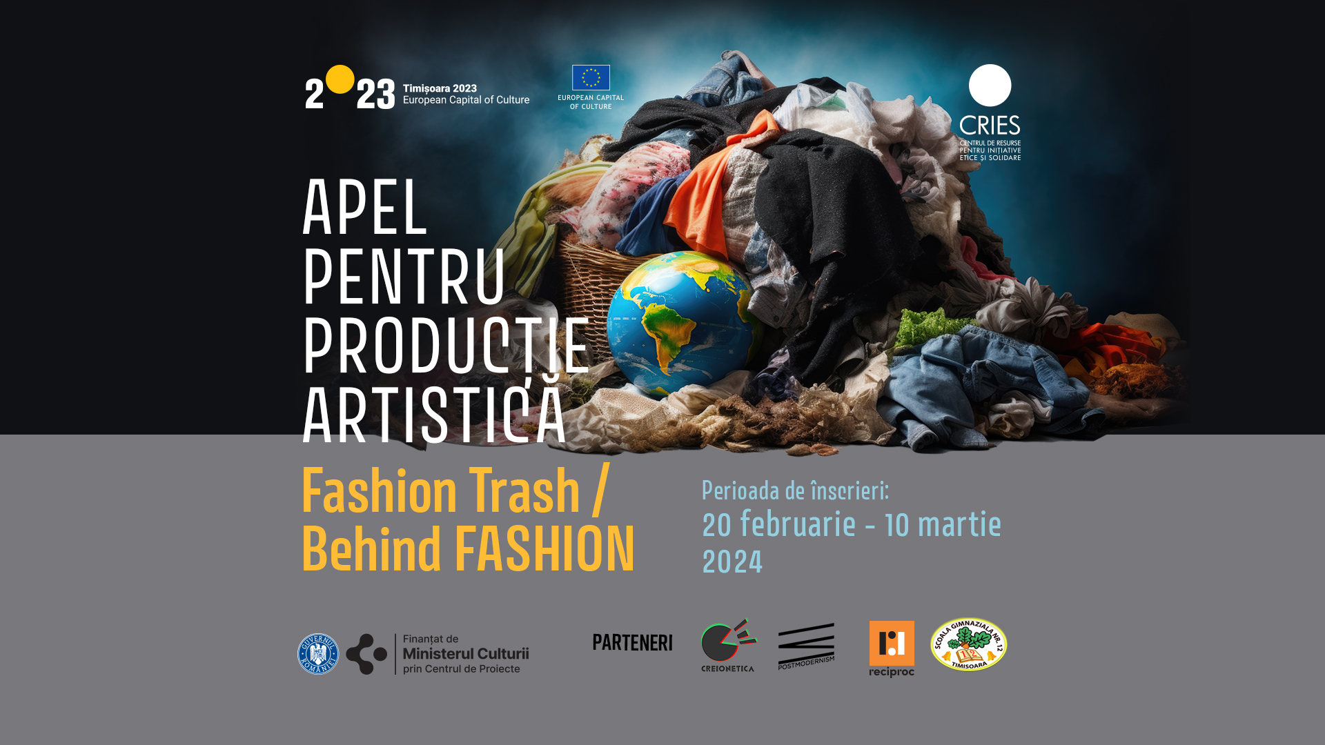 Asociația CRIES - Centrul de Resurse pentru Inițiative Etice și Solidare lansează un apel public pentru artiștii români interesați de problematica socială și de mediu generată de industria modei. Artiștii sunt invitați să creeze o lucrare pe tema „Fashion Trash / Behind FASHION” – sunt așteptate propuneri de proiecte, iar un juriu specializat va selecta artistul câștigător, care va beneficia de un buget de 8.000 de lei pentru a-și pune în practică lucrarea.