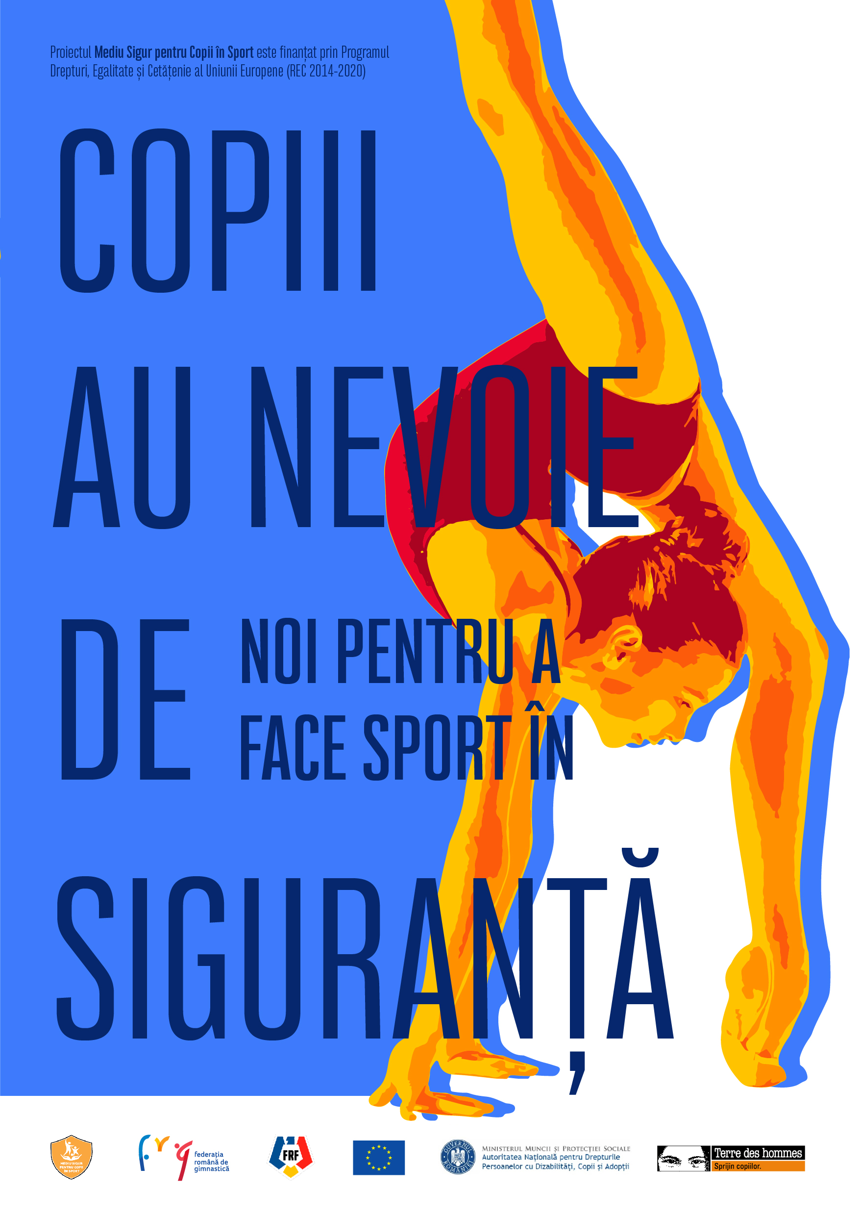 Proiectul „Mediu sigur pentru copii în sport” este finanțat prin Programul Drepturi, Egalitate și Cetățenie al Uniunii Europene (REC 2014-2020). Un proiect implementat de Fundația Terre des hommes Romania, în parteneriat cu Autoritatea Națională pentru Drepturile Persoanelor cu Dizabilități, Copii și Adopții și Federațiile Române de Fotbal și de Gimnastică.