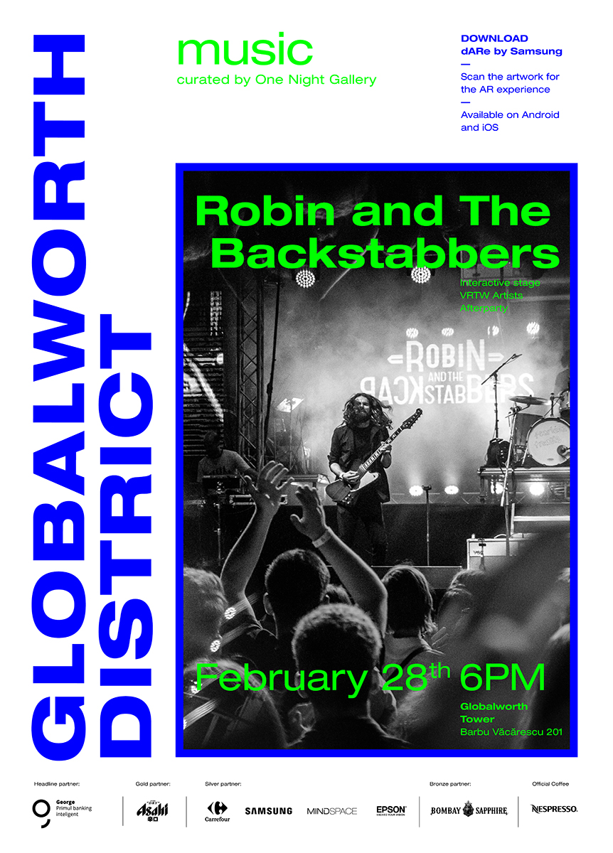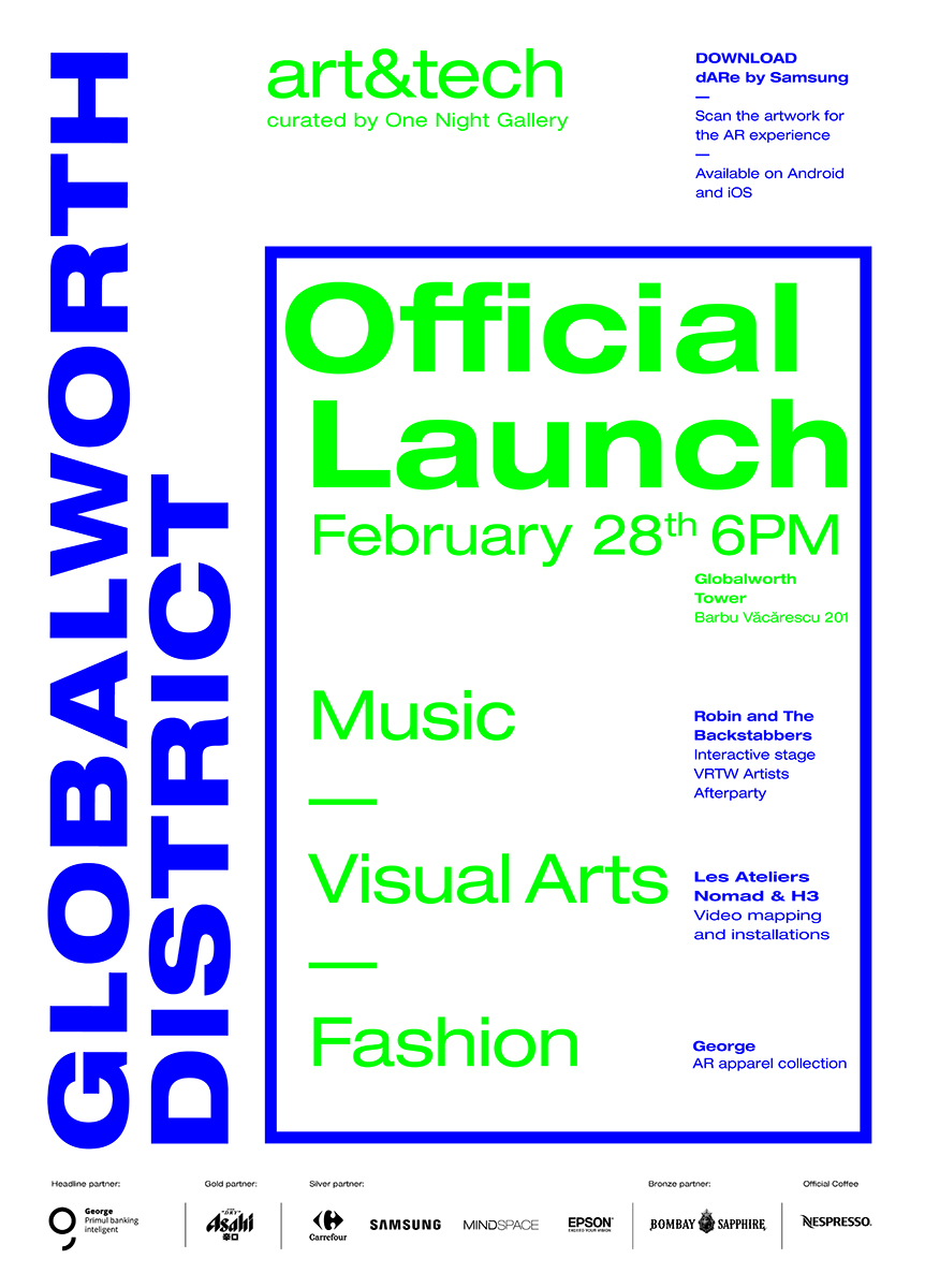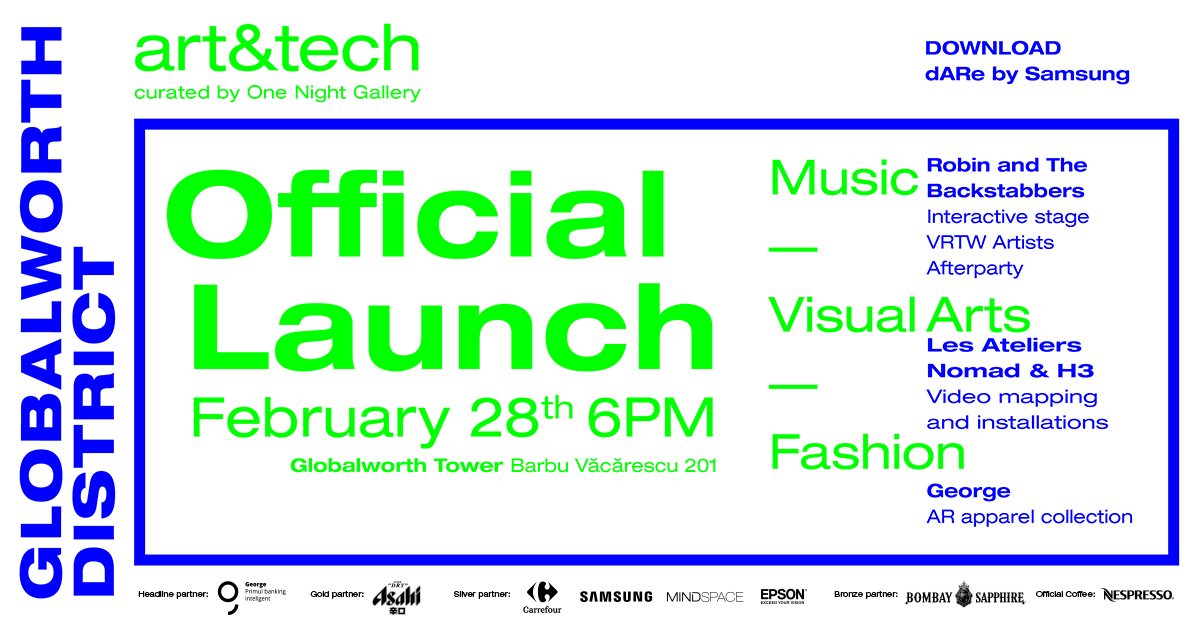 Evenimentul de lansare a Globalworth District va avea loc pe 28 februarie, de la ora 18:00, în clădirea de birouri Globalworth Tower (Barbu Văcărescu 201), și va îmbina într-un show imersiv, conceput de One Night Gallery, tehnologia cu muzica, artele vizuale și design-ul vestimentar. Lobby-ul clădirii va fi scena pentru un eveniment new media art care aduce împreună un concert neconvențional Robin and The Backstabbers, instalații și proiecții realizate de Les Ateliers Nomad și H3, ilustrații supradimensionate de Bogdan Moraru și animate de Tudor Calnegru și colecția George. Primul banking inteligent. Inovație BCR, cu haine ilustrate de artiștii One Night Gallery, ce poate fi scanată în realitate augmentată cu aplicația dARe by Samsung.