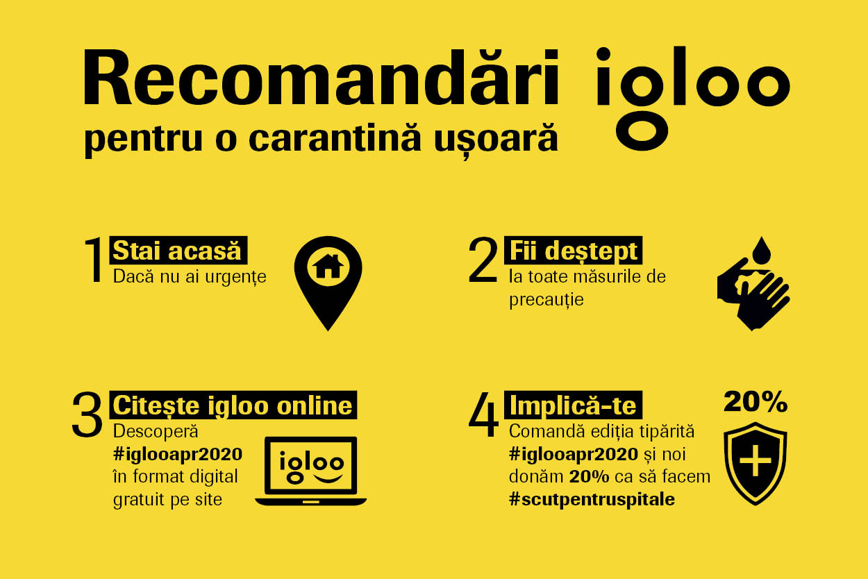 Igloo vă stă la dispoziție la adresa de e-mail: office@igloo.ro sau online pe site, Facebook sau Instagram pentru detalii despre lansarea online a revistei digitale igloo #195_aprilie-mai și despre impactul campaniei #scutpentruspital.
