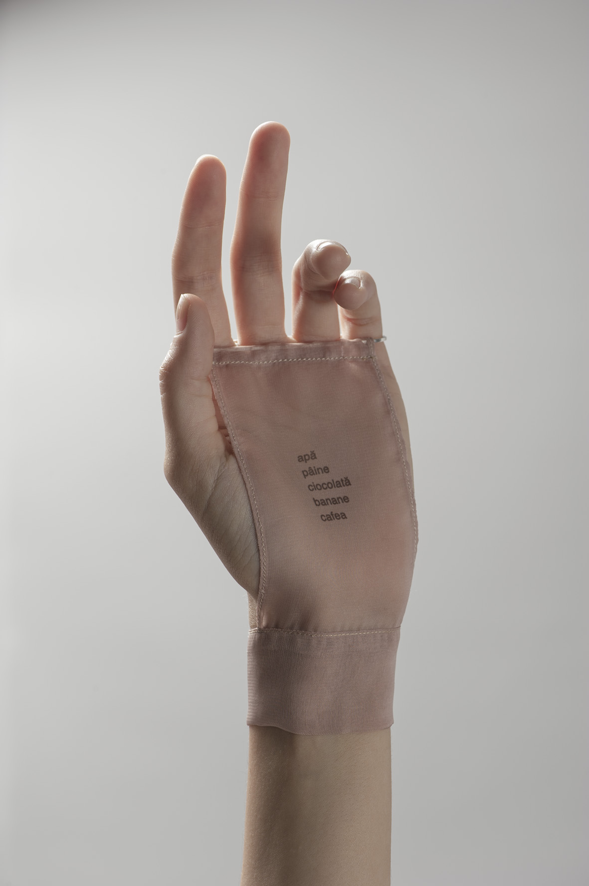 "Nu mă uita" este o mănușă din voal și argint care acoperă palma cu un mesaj: apă, pâine, ciocolată, banane, cafea. O listă de cumpărături sau mai degrabă trusă de supraviețuire în timpul unei depresii severe.