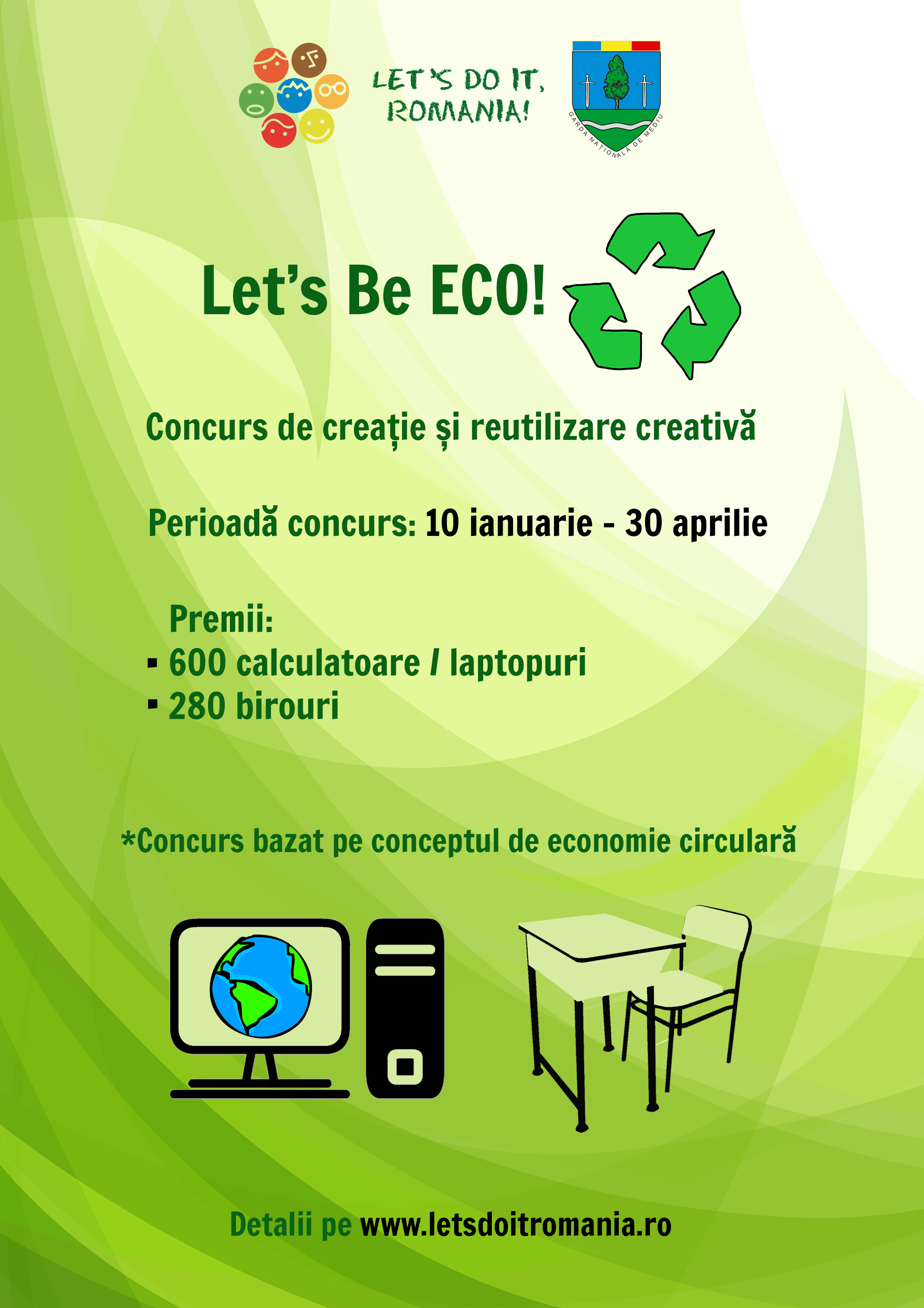 Prima ediție a proiectului de economie circulară "Let’s Be ECO!" va consta într-o competiție dedicată unităților de învățământ din mediul rural. Scopul proiectului este susținerea comunităților din mediul rural prin reutilizarea resurselor. În cadrul proiectului vor fi distribuite peste 280 birouri și alocate în urma disponibilizării aproximativ 600 de calculatoare/laptop-uri. Cele mai implicate 40 de școli vor primi aproximativ 15 calculatoare/laptopuri și 7 birouri. Proiectul este organizat de „Let’s Do It, Romania!”, în parteneriat cu Garda Națională de Mediu.